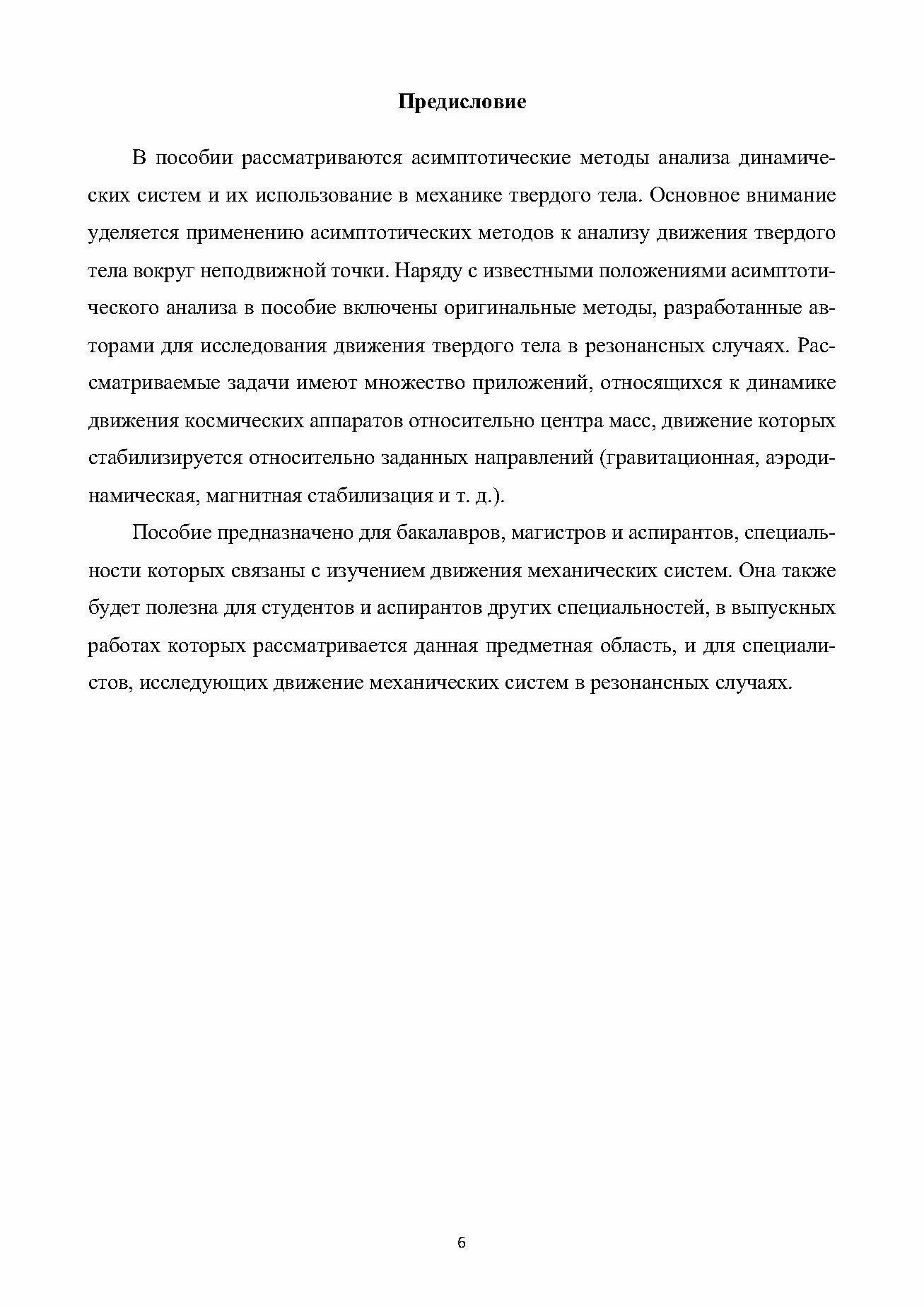 Рассматриваются асимптотические методы в задачах динамики твёрдого тела и связанными с ними приложениями. Используются метод усреднения и метод интегральных многообразий. Основное внимание уделяется исследованию резонансных эффектов при движении твёрдого тела относительно неподвижной точки и вокруг центра масс. Теоретический материал сопровождается примерами применения асимптотических методов в задачах современной космонавтики.