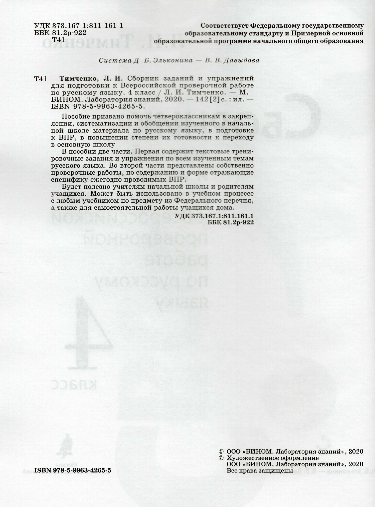 Сборник заданий и упражнений для подготовки к Всероссийской проверочной работе по русскому языку 4 класс (Лариса Ивановна Тимченко); БИНОМ. Лаборатория знаний, 2020