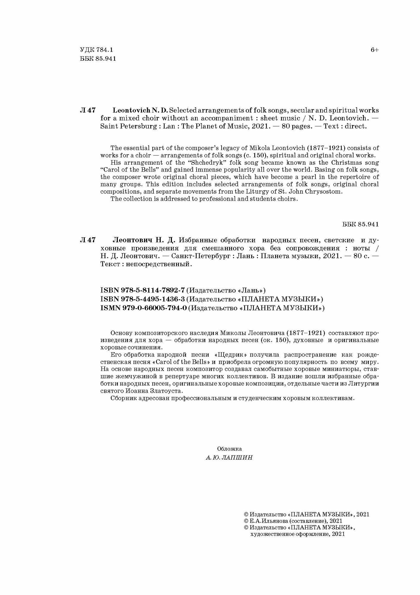 Избранные обработки народных песен светские и духовные произведения для смешанного хора без сопровождения Ноты (Николай Дмитриевич Леонтович); Планета Музыки, 2021