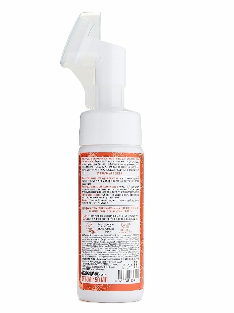 Органическая сертифицированная пенка для умывания для всех типов кожи бережно очищает, увлажняет и успокаивает, нормализуя водный баланс. Ее формула, обогащенная высокоэффективными экстрактами сибирских растений, наполняет кожу энергией и сиянием, придавая здоровый и свежий цвет лицу.