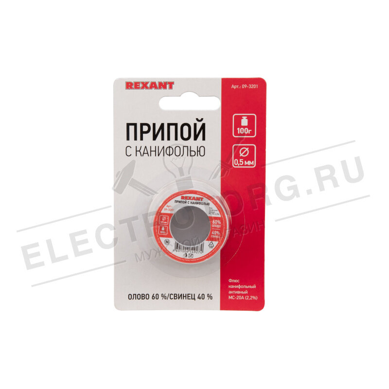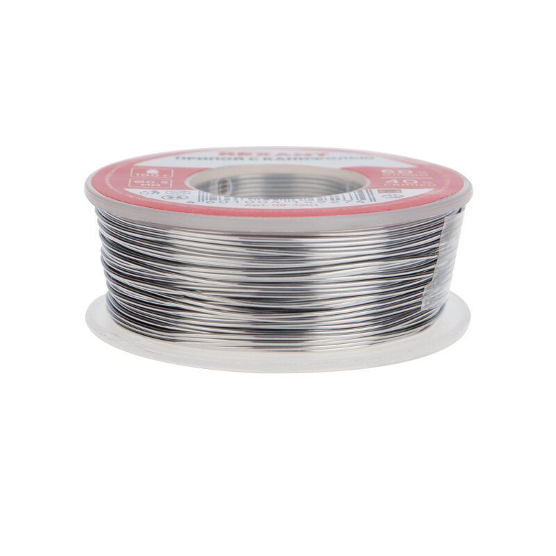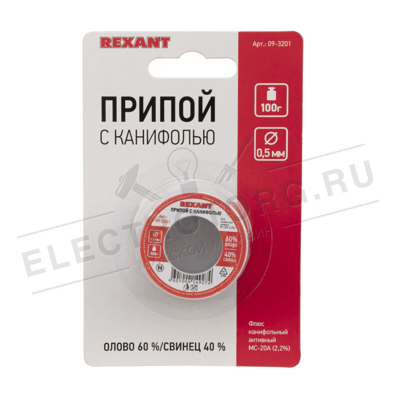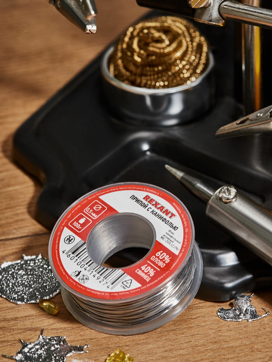 Припой с канифолью REXANT представляет собой проволоку (диаметром 0.5 мм) из сплава олова (60 %) и свинца (40 %). Используется в пайке для соединения деталей между собой и позволяет создать герметичный, механически прочный (устойчивый) шов. Нагреваясь до температуры плавления (183 188 C) припой: расплавляется, смачивает спаиваемый металл и, растекаясь по нему - заполняет место между соединяемыми деталями. В свою очередь флюс канифольный активный (MC-20A) помогает сделать паянное соединение более прочным! Убирая окислительную плёнку со спаиваемых поверхностей и защищая их от дальнейшего окисления при пайке. Содержание флюса в припое - 2,2 %. Как видно из вышесказанного припой с канифолью REXANT - самое что ни на есть два в одном : припой и флюс на катушках по 100 грамм!
