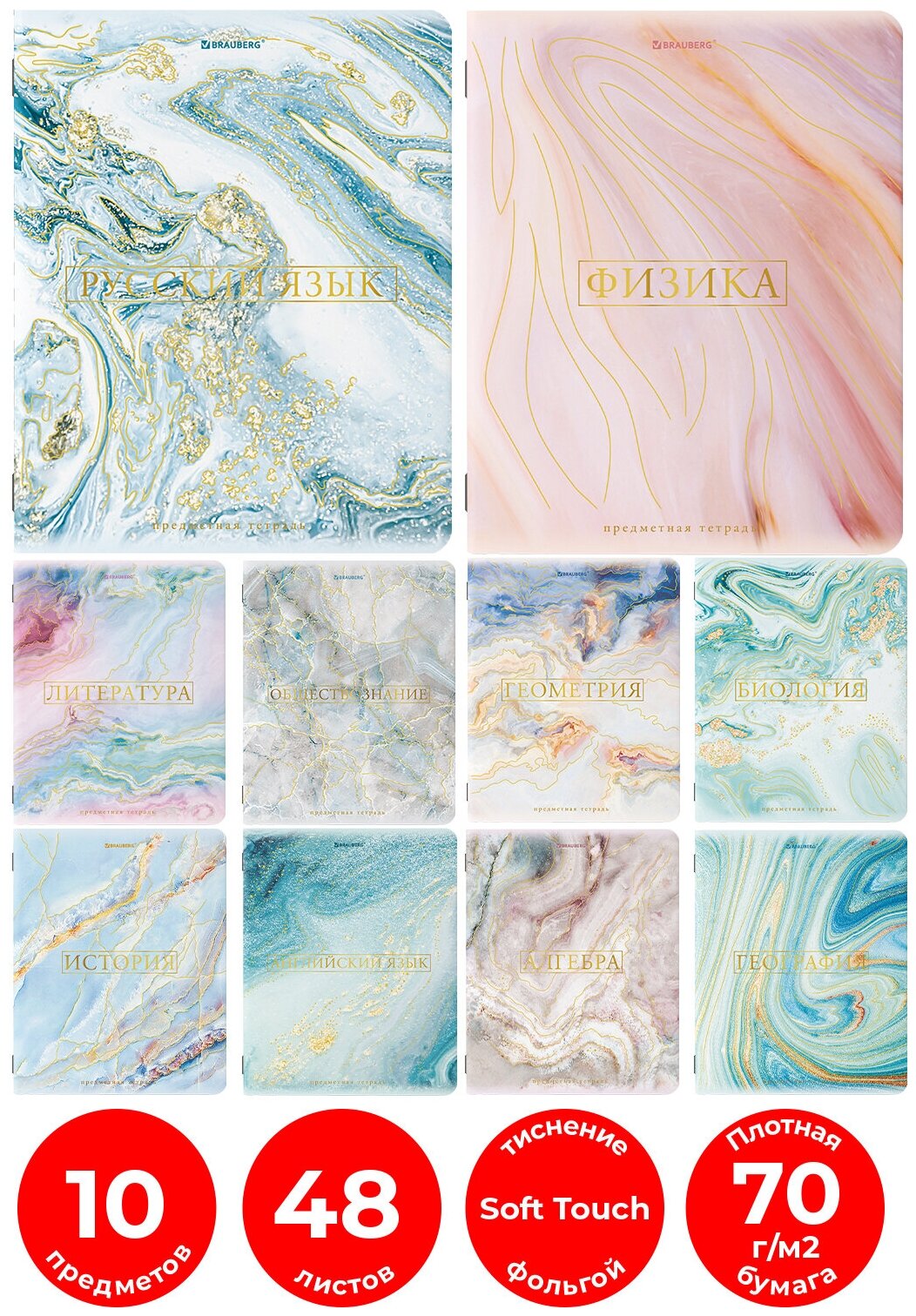 Предметные тетради BRAUBERG из серии "PASTEL" со справочным материалом предназначены для учащихся средних и старших классов. Уникальная ламинация "SoftTouch" с тиснением фольгой обеспечивает обложке мягкий, бархатистый тактильный эффект.