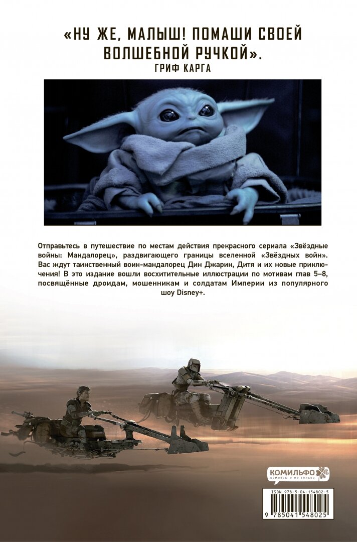 Отправьтесь в путешествие по местам действия прекрасного сериала «Звёздные войны: Мандалорец», раздвигающего границы вселенной «Звёздных войн». Вас ждут таинственный воин-мандалорец Дин Джарин, Дитя и их новые приключения! В это издание вошли восхитительные иллюстрации по мотивам глав 5–8, посвящённые дроидам, мошенникам и солдатам Империи из популярного шоу Disney+.