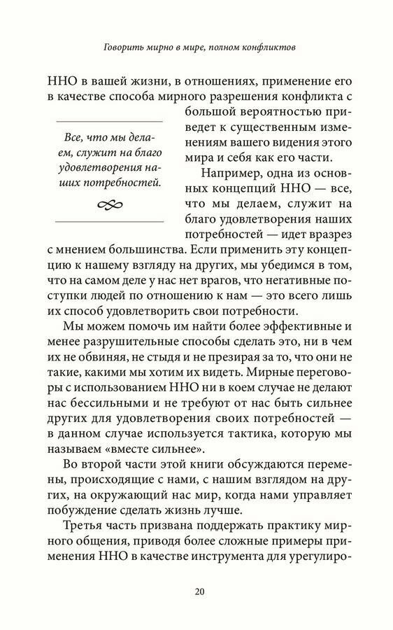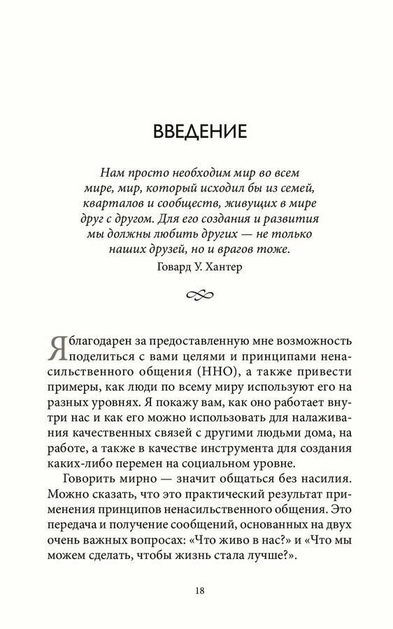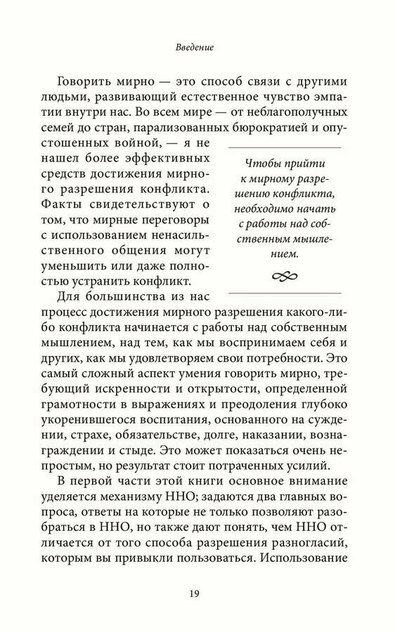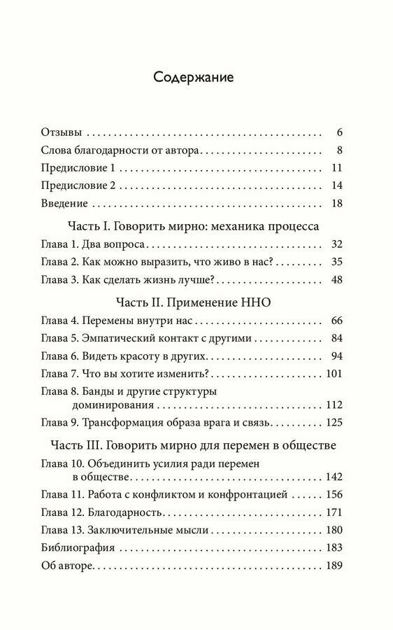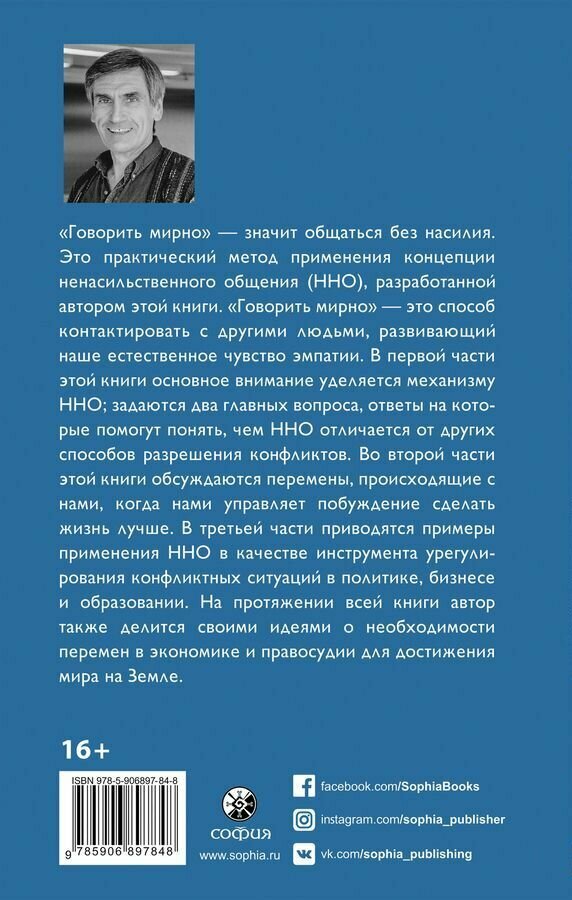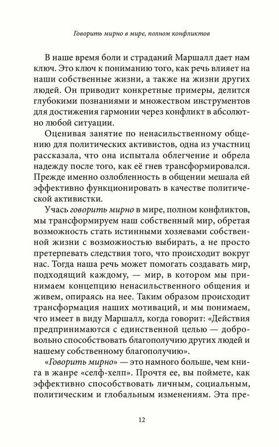 «Говорить мирно» — значит общаться без насилия. Это практический метод применения концепции ненасильственного общения (ННО), разработанной автором этой книги. «Говорить мирно» — это способ контактировать с другими людьми, развивающий наше естественное чувство эмпатии. В первой части этой книги основное внимание уделяется механизму ННО; задаются два главных вопроса, ответы на которые помогут понять, чем ННО отличается от других способов разрешения конфликтов. Во второй части этой книги обсуждаются перемены, происходящие с нами, когда нами управляет побуждение сделать жизнь лучше. В третьей части приводятся примеры применения ННО в качестве инструмента урегулирования конфликтных ситуаций в политике, бизнесе и образовании. На протяжении всей книги автор также делится своими идеями о необходимости перемен в экономике и правосудии для достижения мира на Земле