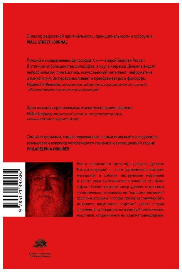 Новая книга знаменитого американского философа Дэниела Деннета (р. 1942) - вдохновенное описание мастерской и рабочих инструментов мыслителя, которое одновременно является своего рода синтетическим изложением его философии. Особое внимание автор уделяет мысленным экспериментам, которые он называет "насосами интуиции", коротким историям, "которые призваны стимулировать искреннее, прочувствованное интуитивное озарение". Не ограничиваясь такими хорошо известными инструментами мышления, как бритва Оккама или reductio ad absurdum, автор предлагает множество собственных изобретений такого рода. Его цель, как всегда, состоит в том, чтобы научить нас "серьезно и не без изящества размышлять об очень сложных вещах". Книга, явившаяся из личного опыта философа - настоящий путеводитель как по вселенной человеческого мышления, так и по философии сознания Д. Деннета, и она будет интересна не только профессиональным философам, но и любому человеку, стремящемуся лучше разобраться в природе собственной мысли.