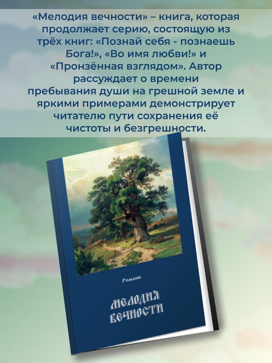 «Мелодия вечности» – книга, которая продолжает серию, состоящую из трёх книг: «Познай себя – познаешь Бога!», «Во имя любви!» и «Пронзённая взглядом». Как и прежде, автор рассуждает о времени пребывания души на грешной земле и яркими примерами демонстрирует читателю пути сохранения её чистоты и безгрешности. «Хочешь жить хорошо и счастливо, храни веру, любовь, кротость, терпение, смирение своей души». Написанная с благословения Господа, книга дотронется до каждого сердца и напомнит о верном пути сохранения духовной чистоты – через покаяние и молитву.