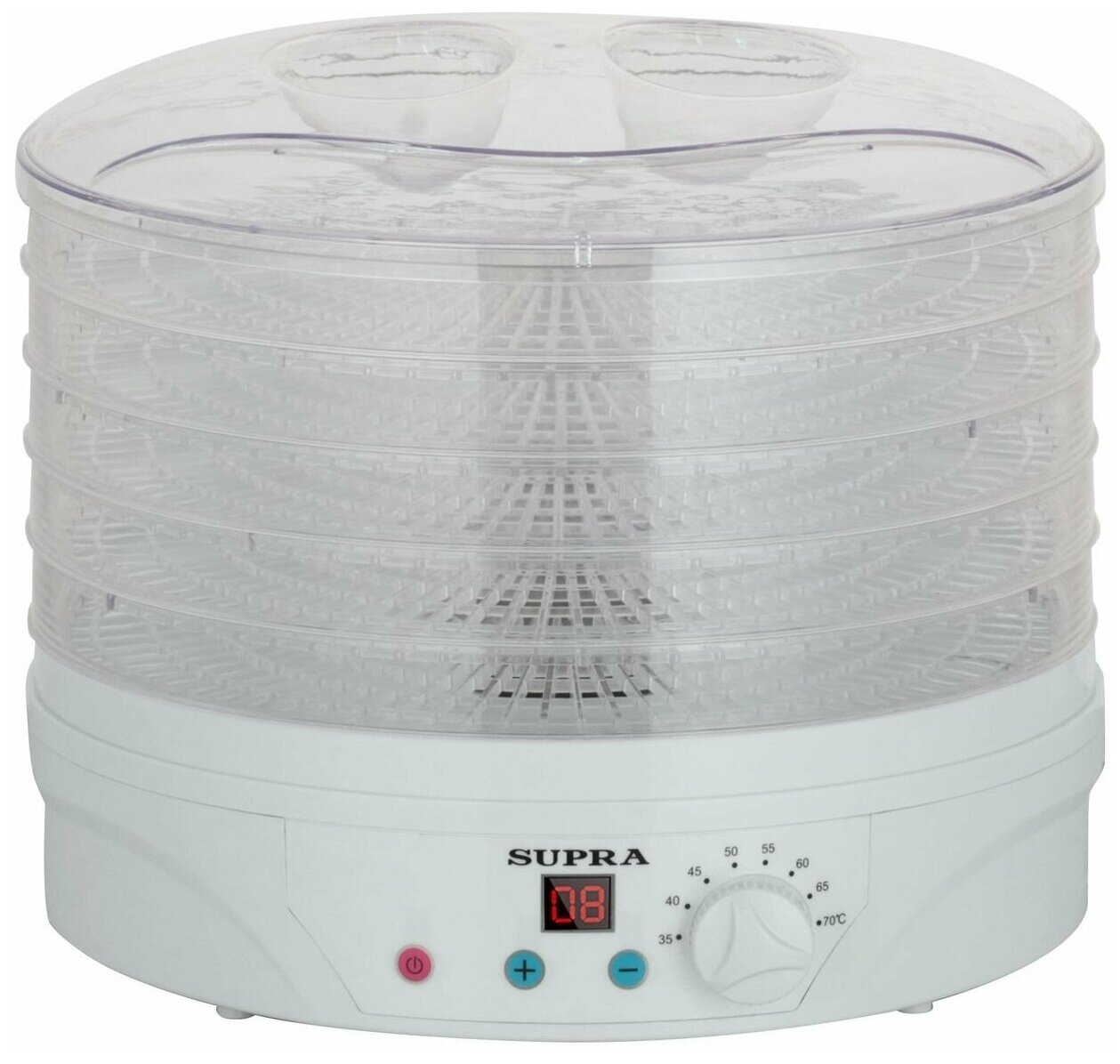 С помощью электросушки Supra запасти продукты, сохранив все их полезные свойства, не составит труда. Устройство снабжено пятью поддонами, в которых можно одновременно обрабатывать внушительный объём фруктов, ягод, грибов, лекарственных трав и другого. Также эта модель позволяет сушить рыбу, мясо и готовить пастилу. УДОБНОЕ ПРИМЕНЕНИЕ Все секции прозрачные, что обеспечивает лёгкий контроль за процессом. В зависимости от вида продукта вы сможете устанавливать нужную температуру с помощью простого электронно-механического регулятора. Её диапазон варьируется в пределах от 35 до 70 °С. Каждый отсек снабжён крышкой, поэтому вы можете закладывать одновременно разные продукты – они не обменяются запахами.