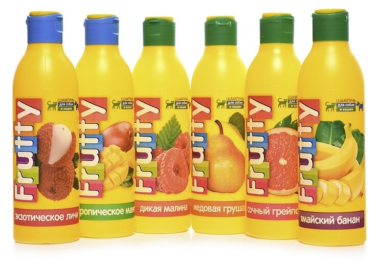 Зоошампуни Frutty представлены для собак и кошек следующими ароматами: Ямайский банан, Дикая малина, Сочный грейпфрут, и Медовая груша.