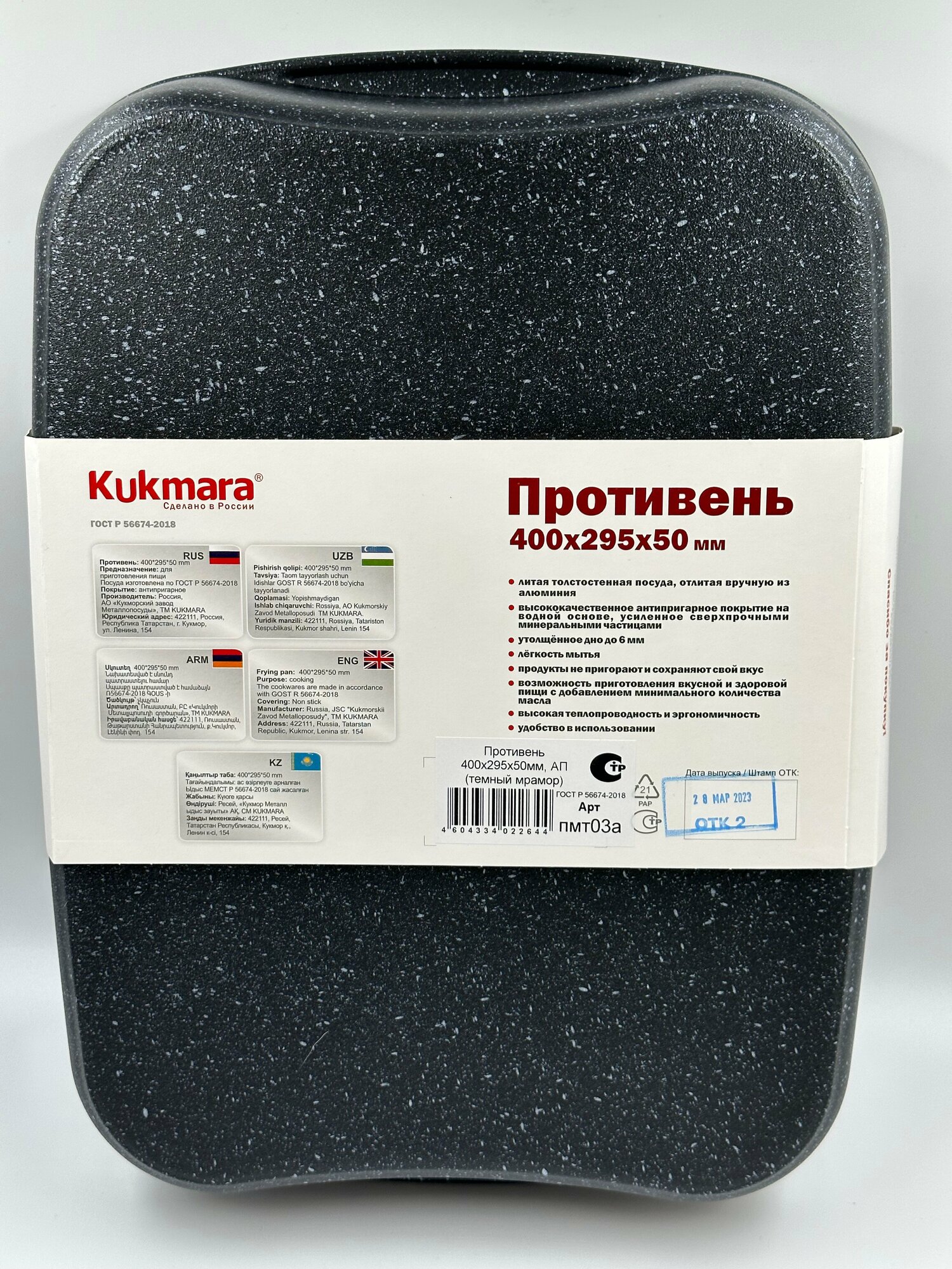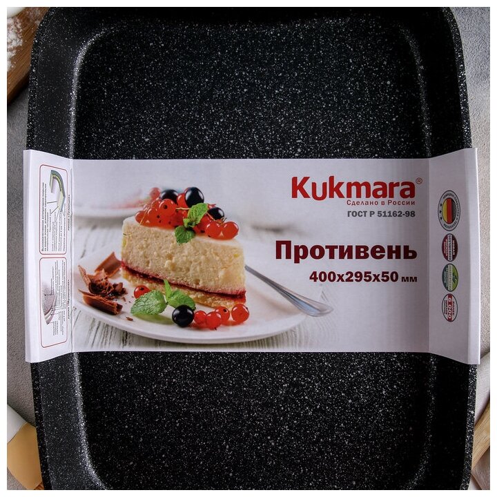 Красивая и удобная посуда линии Мраморная спокойных тонов создаст уютную атмосферу на кухне. Немаловажным является и широкий ассортимент, благодаря чему в рамках единой коллекции можно собрать свой собственный набор посуды.Противень - верный спутник хозяйки на кулинарном поприще. Готовить в противне Kukmara с антипригарным покрытием приятно и комфортно. Нет необходимости постоянно следить за тем, чтобы еда не пригорела - все просто: включаете духовку и, пока она греется, занимаетесь подготовкой продуктов, ставите блюдо в духовку, заводите таймер – и свободны!В данной линейке противни представлены в двух цветовых решениях: темный и кофейный мрамор.Мраморное, сверхпрочное, антипригарное покрытие с твердыми частицами натурального мрамора нового поколения на водной основе разработано специально для интенсивного использования на каждый день. Антипригарное покрытие надолго сохраняет первозданную привлекательность посуды, а превосходные антипригарные свойства будут радовать на протяжении очень долгого времени. Допускает использование только деревянных и силиконовых предметов. Покрытие абсолютно безопасно для здоровья, без PFOA. Покрытие не требует особенного ухода, легко моется как вручную, так и в посудомоечной машине.Преимущества противня Kukmara:значительная толщина стенок и дна (до 6мм) исключает деформацию противня;возможность использования минимального количества масла;усиленная антипригарная система;продукты не пригорают и сохраняют свой вкус;легкость мытья;использование в духовом шкафу, а также подходит для всех типов плит, кроме индукционных;можно мыть в посудомоечной машине.Процесс приготовления еды приятнее вместе с посудой Kukmara!