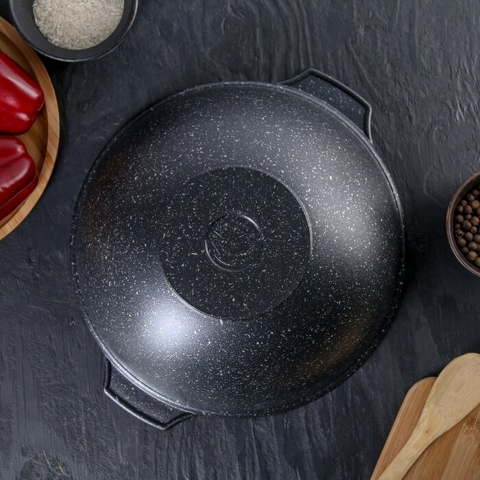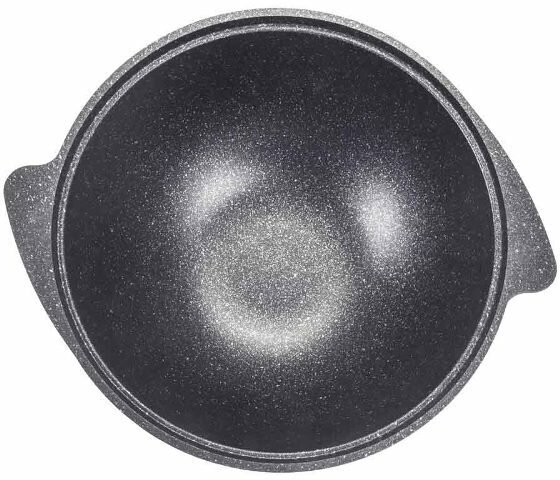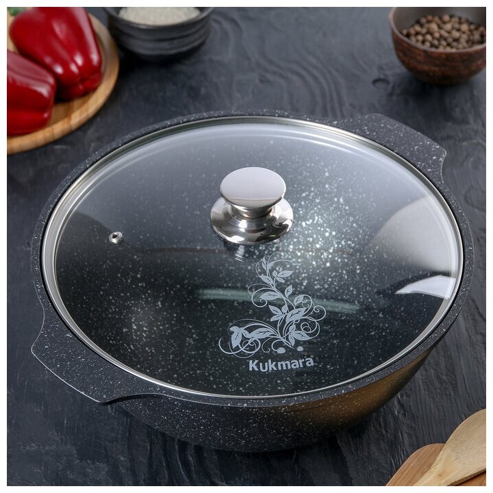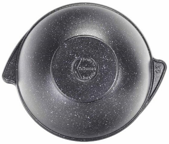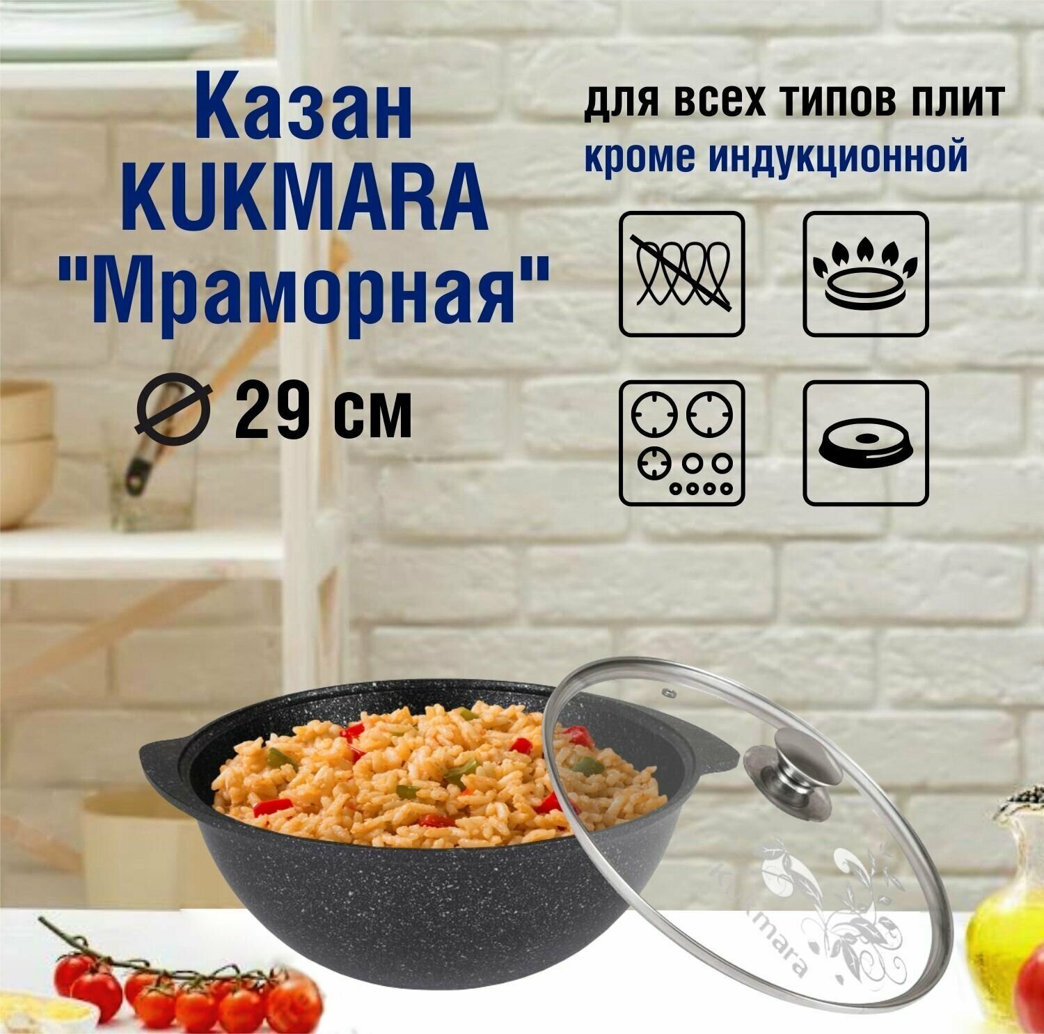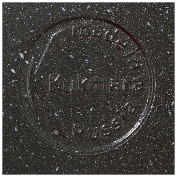 Казан Kukmara черного цвета (КМК47А) изготавливается из литьевого алюминия, что обеспечивает устойчивость к деформациям. Покрытие выполнено из антипригарного мрамора современного образца, изготовленного на водной основе. Он усилен твердыми и прочными частицами минералов, что не позволяет ему стираться на протяжении длительного времени.