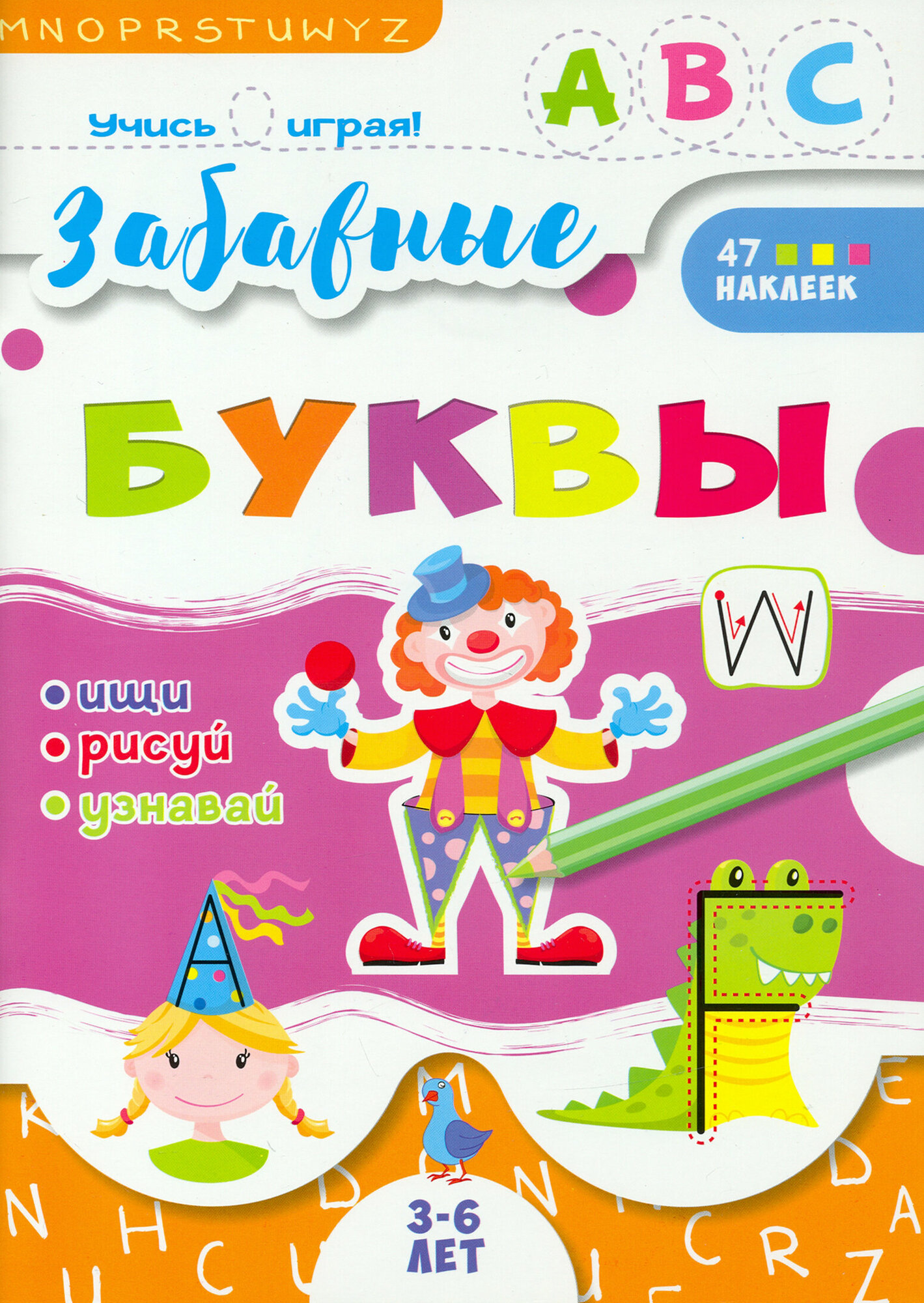 В этой книжке буквы спрятались в самых неожиданных местах. А ещё они могут принимать разные формы. Нужно внимательно смотреть на картинки, и тогда обязательно найдётся и буква W, притаившаяся в костюме клоуна, и буква F, притворившаяся драконом, и все-все буквы. Использование красочных наклеек превратит обучение в интересую весёлую игру.