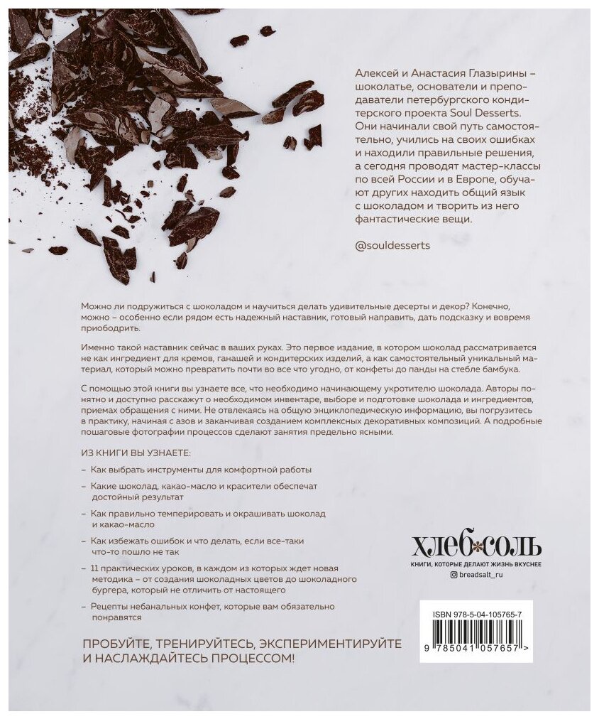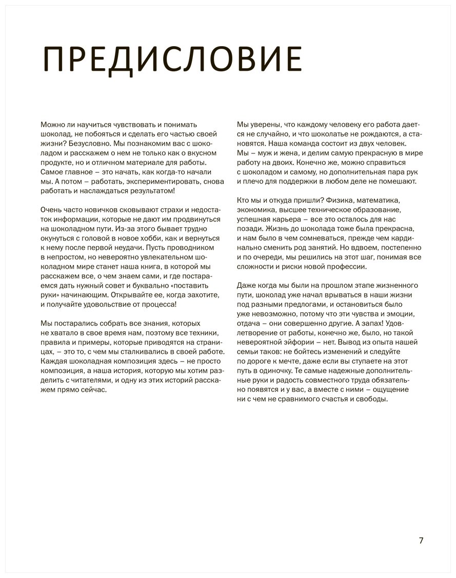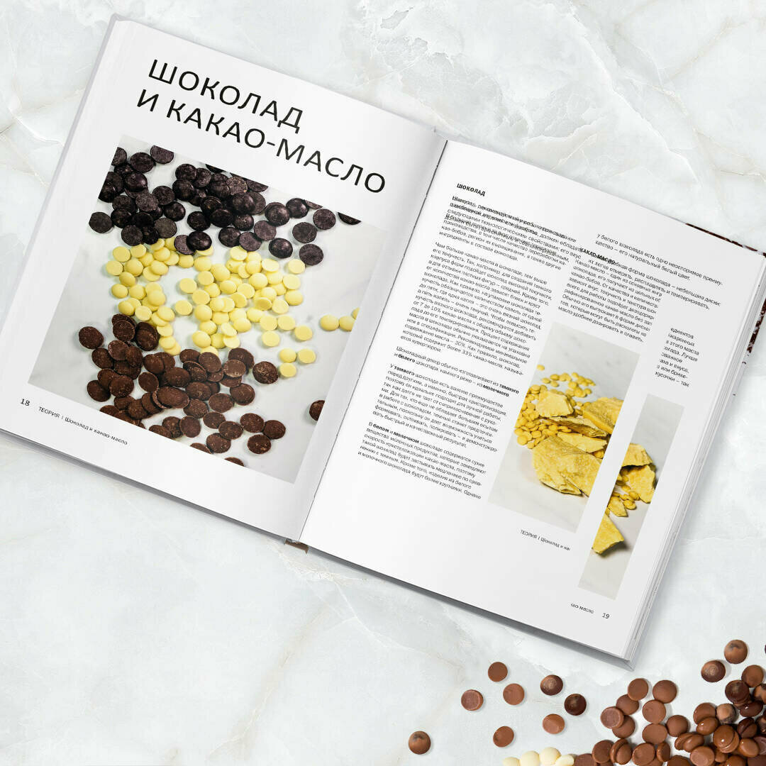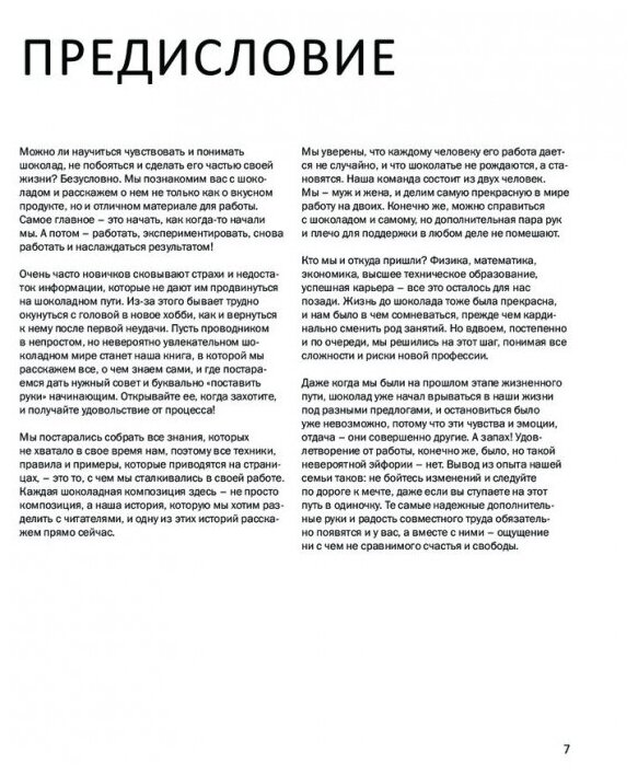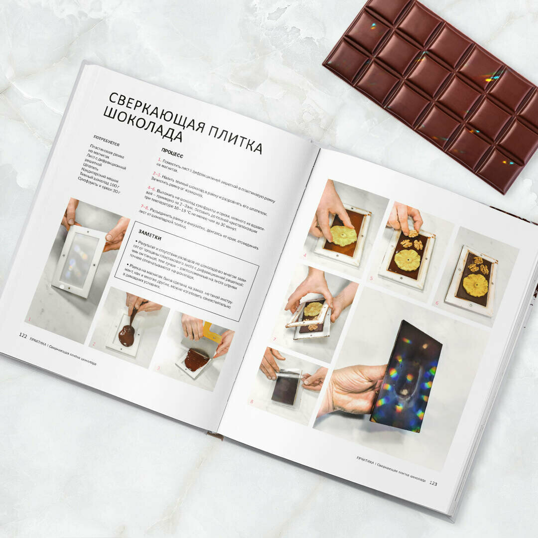 Если хотите начать работать с шоколадом — эта книга для вас. Книга представляет собой иллюстрированное пособие всех этапов создания шоколадных конфет, фигур, плиток. Перед началом практики, есть объемный блок теории, которая поможет разобраться в основных вопросах, подскажет, что нужно купить. В книге представлены удивительные варианты декора, которые легко можно приготовить самостоятельно следуя инструкциям. Книга полезна и проста, я очень довольна покупкой, в ближайшее время пойду еще и на живой мастер-класс авторов.