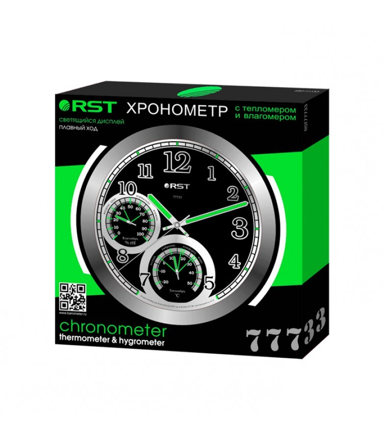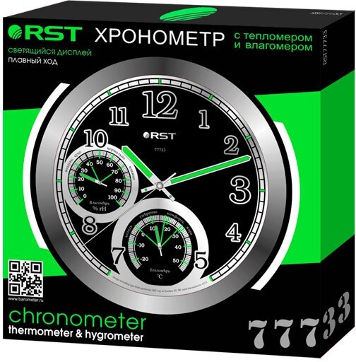 Светящиеся настенные часы RST выполнены в стальном корпусе. Циферблат также выполнен в стиле металлик с цифрами, делениями, а также измерителями температуры и влажности в помещении. В дневное время суток элементы часов заряжаются от света, в ночное стрелки и деления светятся ненавязчивым зеленым цветом. Стили идеально впишутся в дизайн интерьера Хай-тек.