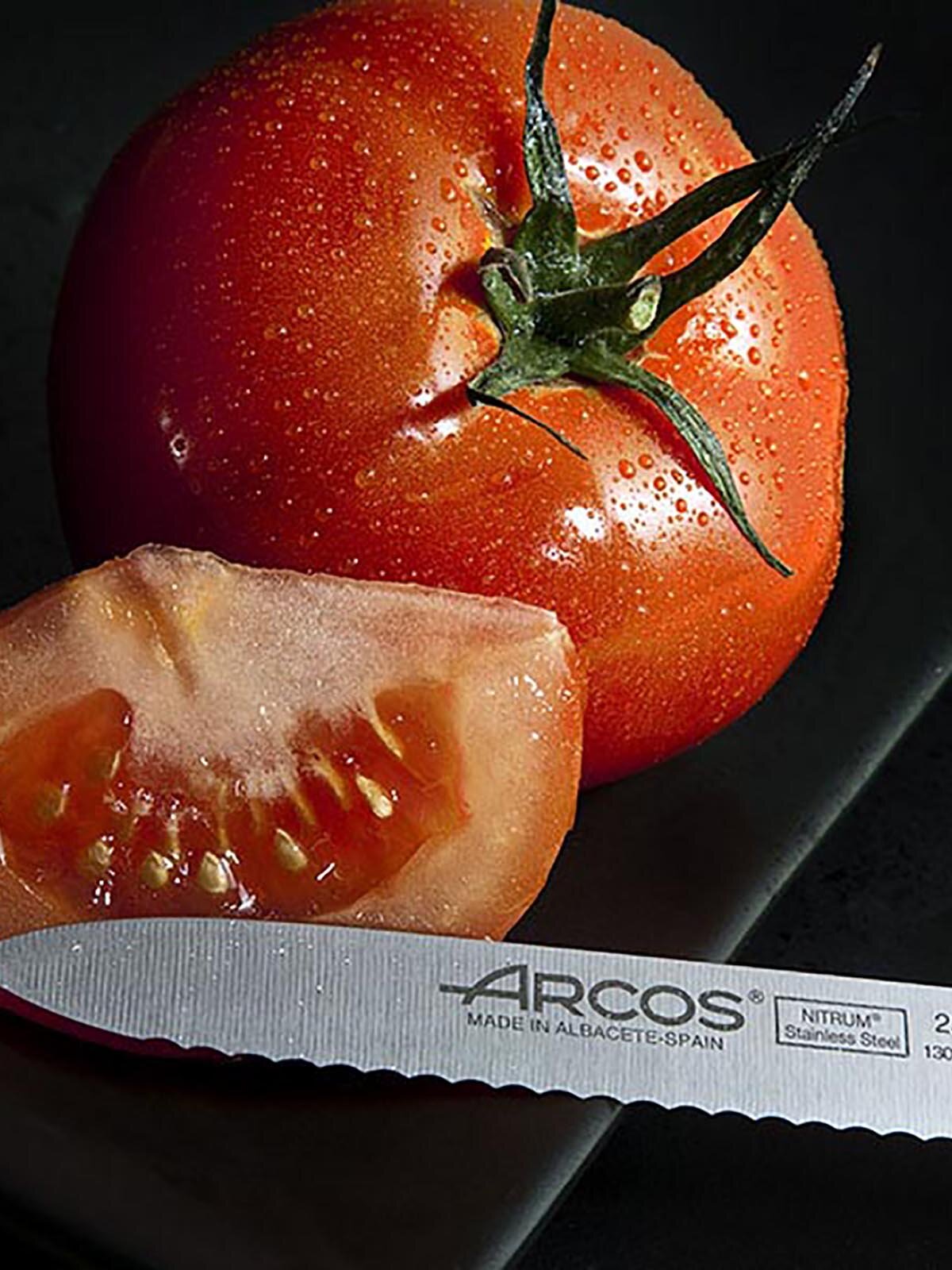 Этот поварской нож с лезвием длиной в 20 см подходит практически для любых работ на кухне. Твердость лезвия составляет до 56 единиц по шкале Роквелла, что является довольно высоким показателем для кухонных ножей. Достигается особая прочность конструкции благодаря инновационной технологии ковки лезвия, используемой исключительно компанией ARCOS. Она носит название «Sub Zero»: в ходе обработки стали она прокаливается до тысячи ста градусов, а потом резко охлаждается до минус ста, а не до нуля, как это принято при традиционном изготовлении стальных клинков. Такая технология позволяет добиться высокой прочности и придает стали антикоррозионные свойства.