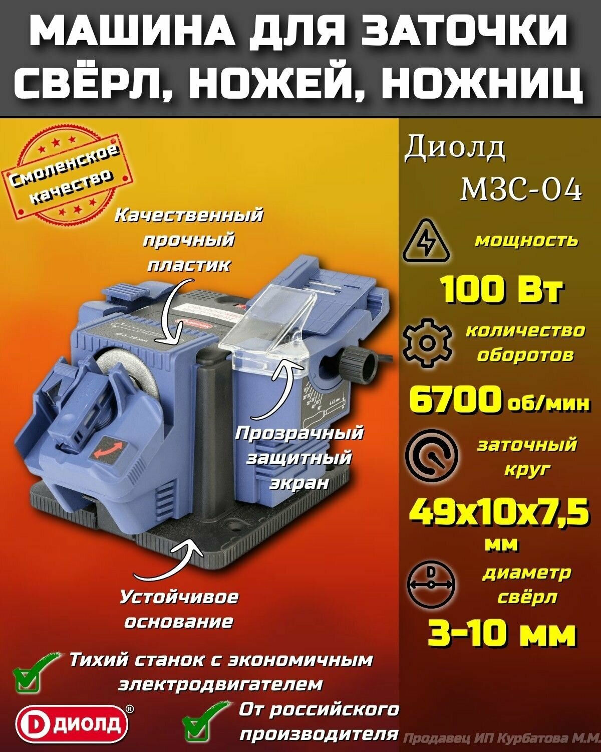 ДИОЛД МЗС-04 - многоцелевой станок для заточки сверл диаметром 3-10 мм, ножей, ножниц, стамесок и зубил шириной 6-51 мм.