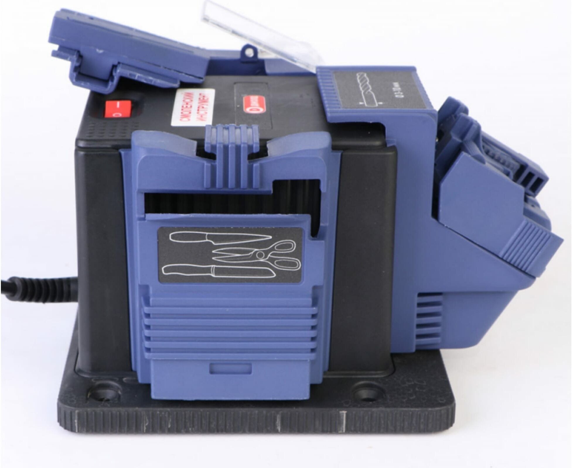 Многоцелевой заточной станок для заточки сверл диаметром 3-10 мм, ножей, ножниц и стамесок. Прозрачный защитный экран из пластика препятствует попаданию искр на пользователя и обеспечивает визуальный контроль над обрабатываемой заготовкой.