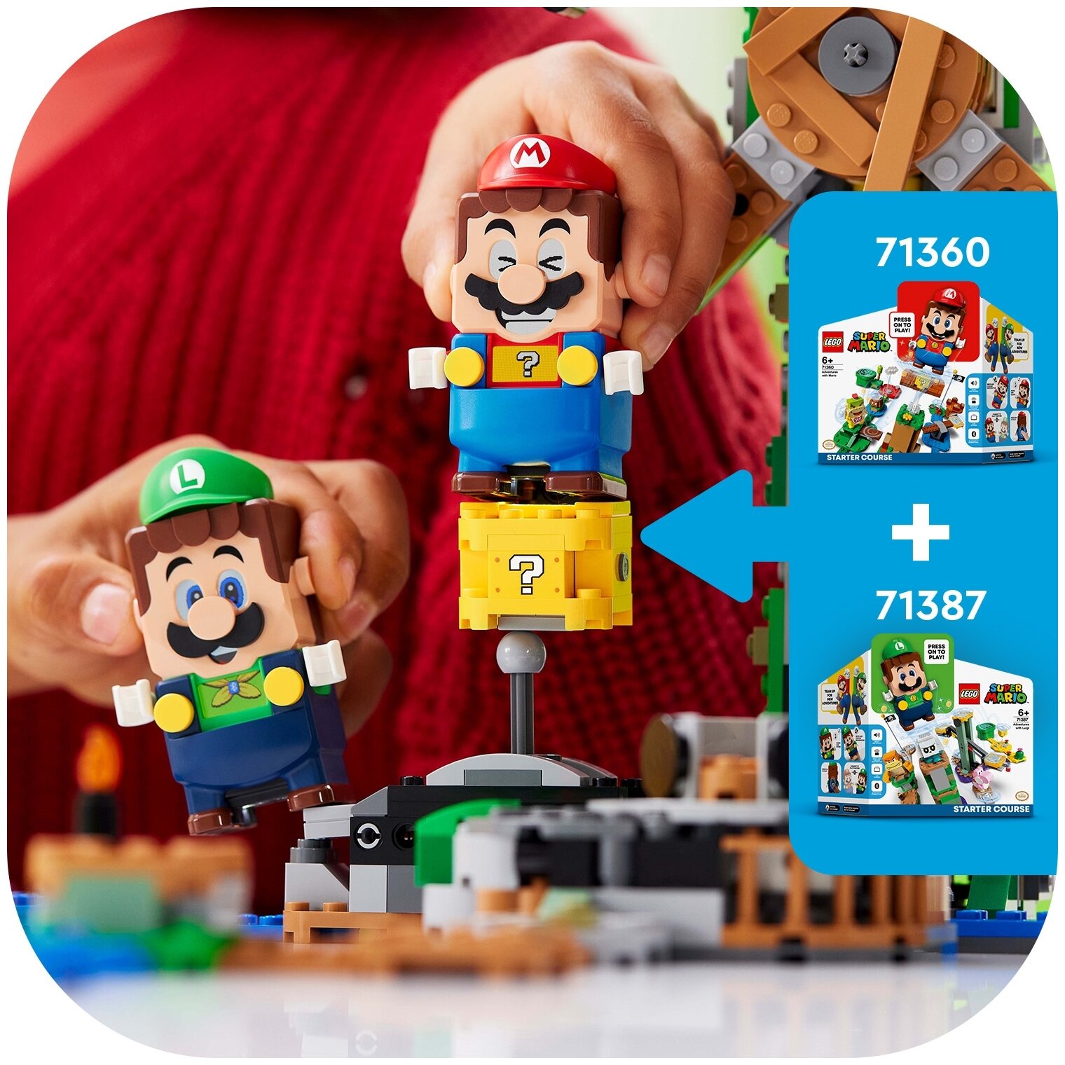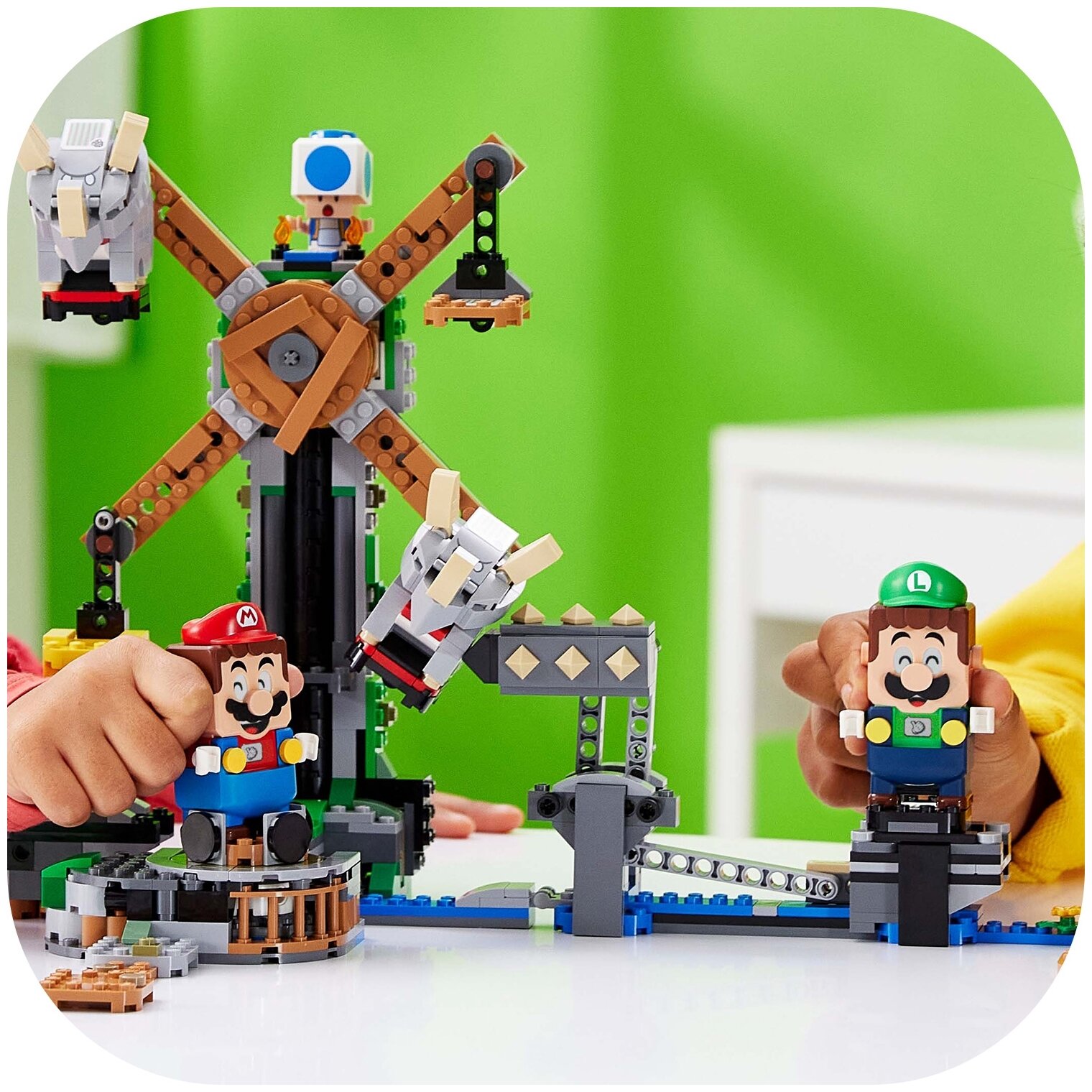 Игровой дополнительный набор (используется со стартовыми наборами 71360 или 71387). Он оснащен сборными вращающимися платформами, которые вращаются, поворачивая Марио и Луиджи (фигурки не включены) на подключенной подставке. Используйте вертел, чтобы сбить 2 фигурки Резнора с вращающихся платформ и спасти Синюю жабу сверху. В комплект также входят качели и специальная труба для испытаний на скорость. Для игры потребуется установить бесплатное приложение LEGO Super Mario. Размер конструктора - 25х56х30 см.