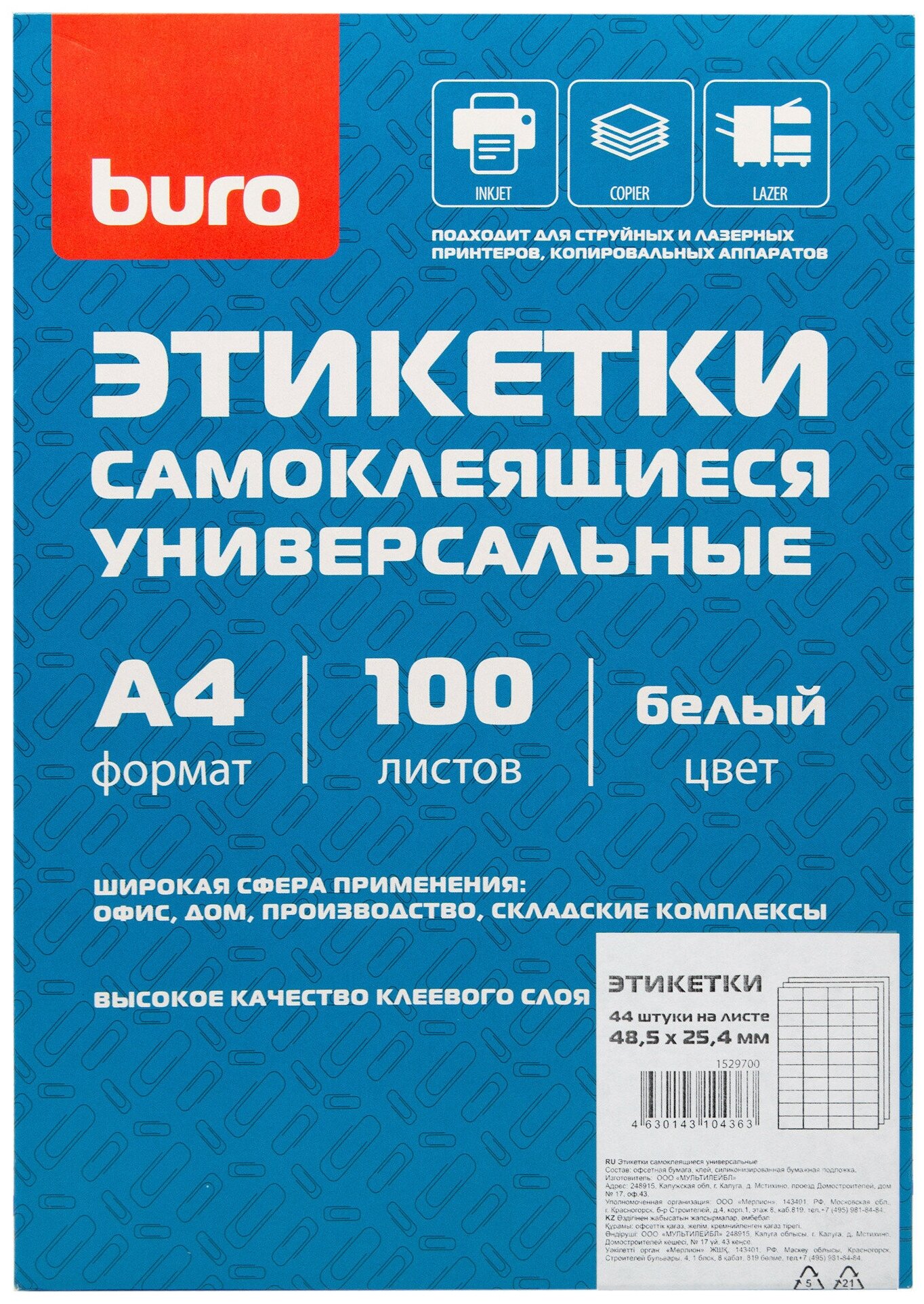 Этикетки самоклеящиеся универсальные (100 листов 485x254 мм по 44 шт. на листе) (1529700) Buro