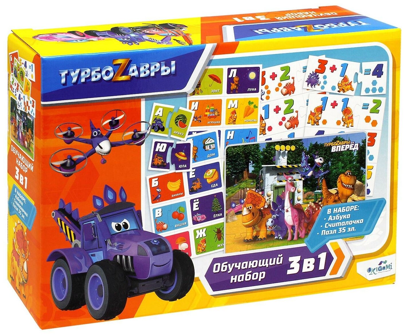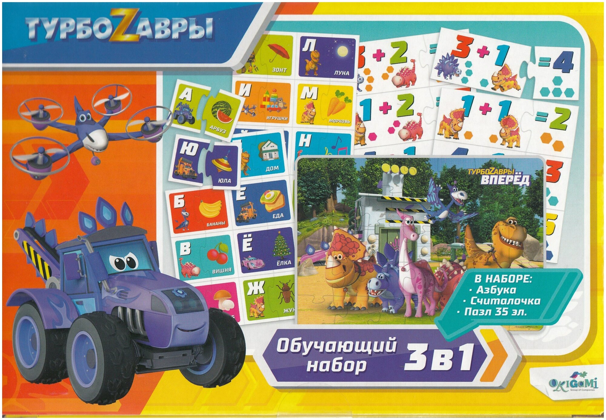 Обучающий набор 3в1 создан для эффективных занятий с ребенком. Внутри красивой подарочной коробки, выполненной в дизайне Турбозавров, вы найдете азбуку из 64 пазловых элементов (52х39 мм) Считалочку из 16 примеров (100х39 мм) и пазл из 35 элементов (330х460 мм).