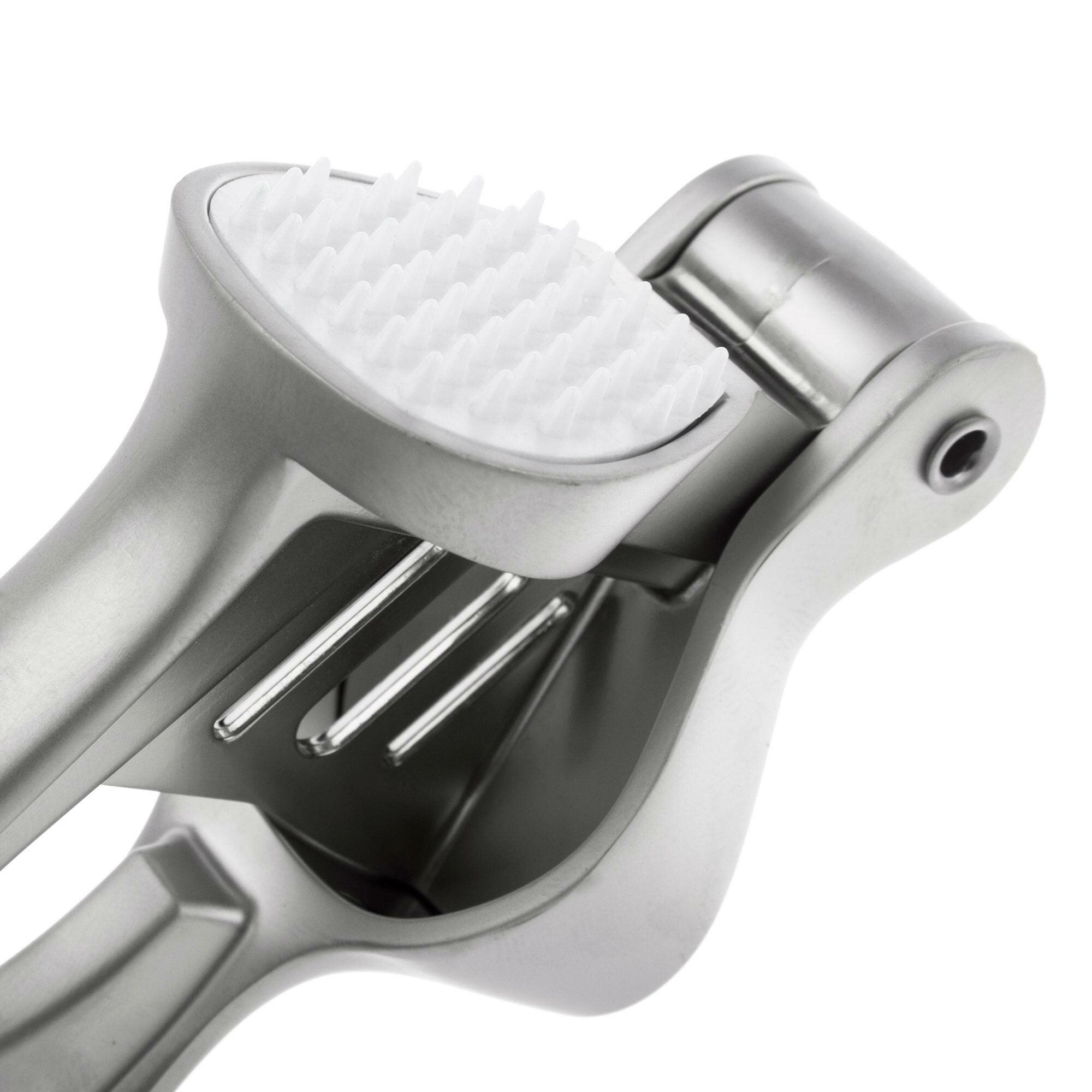 Этот стильный пресс для чеснока очень удобен в использовании: он легко и быстро раздавит зубчики чеснока, а остатки легко вычистить при помощи специальной силиконовой насадки. На ручках пресса предусмотрены две нескользящие вставки для удобства при использовании.