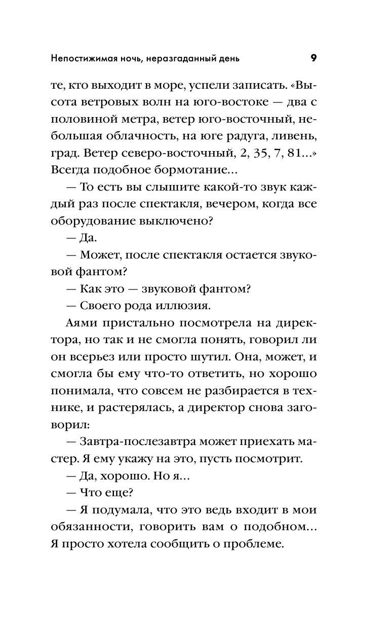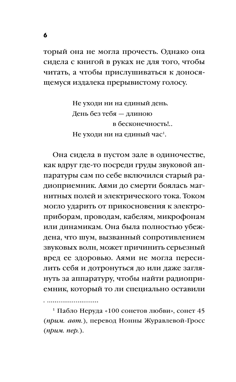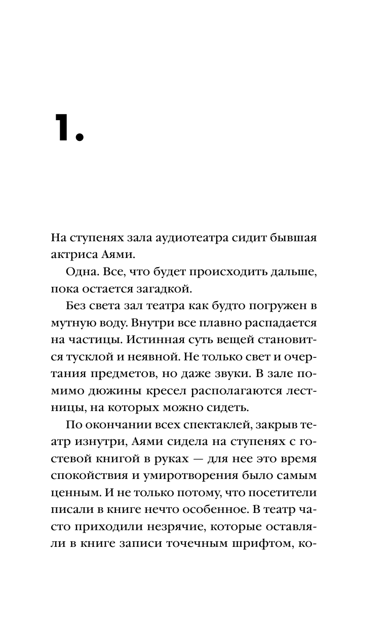 Роман-фантасмагория, роман-сновидение в душную ночь. Далеко не сразу понимаешь, что главная героиня Аями - умерла двадцать лет назад. Но она или ее призрак проходит по тем же улицам Сеула, она задает вопросы, ее размытое изображение осталось на фотографии. Ее образ всплывает также, как бормотание радио. Она - отклик на чей-то зов. Она снится снова и снова - директору аудиотеатра? или тому писателю-репортеру, который сочиняет роман?