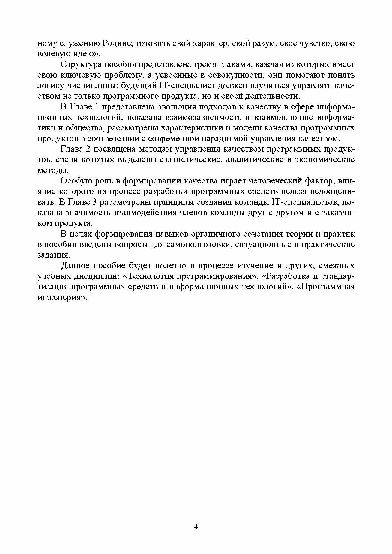 В учебном пособии рассматривается одна из важнейших проблем информационного общества - проблема качества в сфере информационных технологий. Освещены вопросы, связанные с эволюцией подходов к качеству программного обеспечения, описываются технологии и методы управления качеством программных продуктов. Особое внимание акцентируется на роли человеческого фактора в формировании качества.