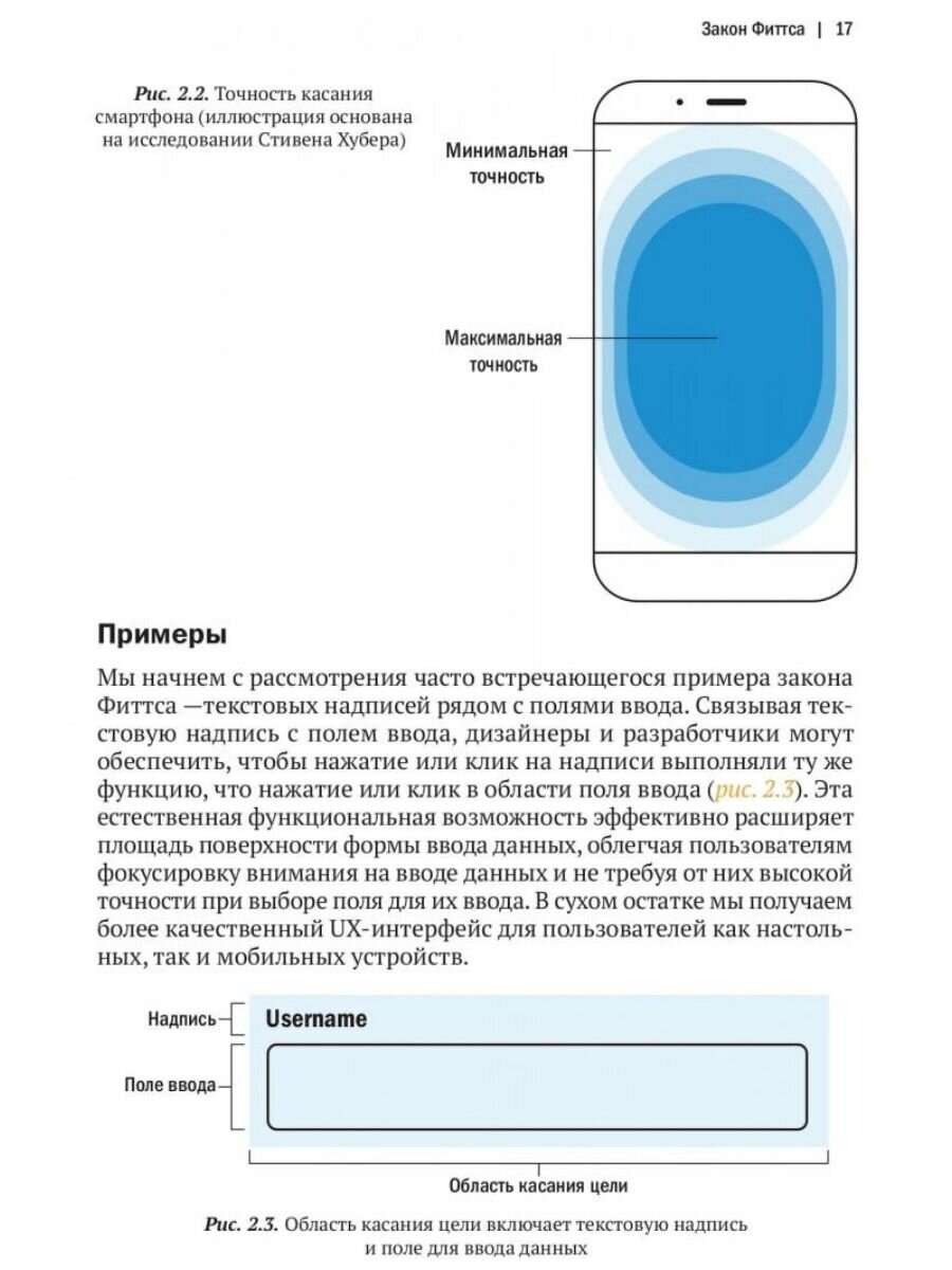 Описаны законы Якоба (о привычном интерфейсе), Фиттса (о времени достижения цели), Хика (о времени, необходимом для принятия решения), Миллера (о кратковременной памяти пользователя), Постела (о балансе консервативного и либерального), Теслера (о степени сложности системы) и эффект фон Ресторффа (о самом запоминающемся объекте). Обсуждается правило «на пике и в конце», связанное с особенностью выработки суждений. Также рассмотрен эффект восприятия эстетически приятного дизайна как наиболее удобного в использовании.
