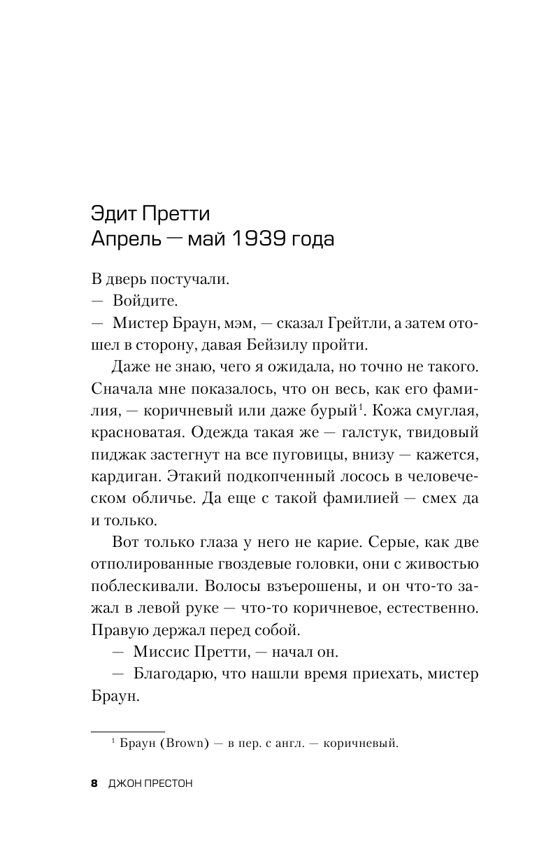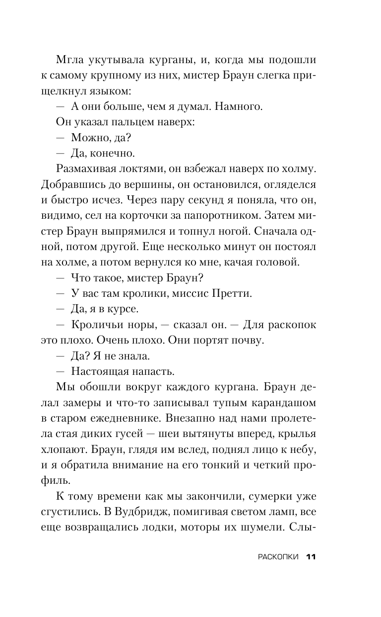 Дальше то, что мне понравилось меньше. Собственный стиль романа суховат и протоколен. Изумила надпись на обложке за авторством аж Роберта Харриса: «Захватывающая история любви и потерь». Надо думать, он не книгу читал, а фильм смотрел. (Я не смотрела, но прочла пересказ.) В книге герой-археолог (Браун) – вполне удачно женатый мужчина с лицом, похожим на мордочку хорька, а героиня-помещица (Эдит) – больная вдова лет под шестьдесят. Никаких намеков на роман или что-то подобное между ними нет, общаются они мало и поверхностно. Второй намек на любовную линию тоже автором книги не развит: археологиня Пегги один раз слушала в лесу соловьев с фотографом Рори, они обменялись историями детства, но дальше этого дело не пошло. В фильме Эдит омолодили лет на двадцать и сделали похожей на хрупкую девочку, потому что ну какое же кино без любви?