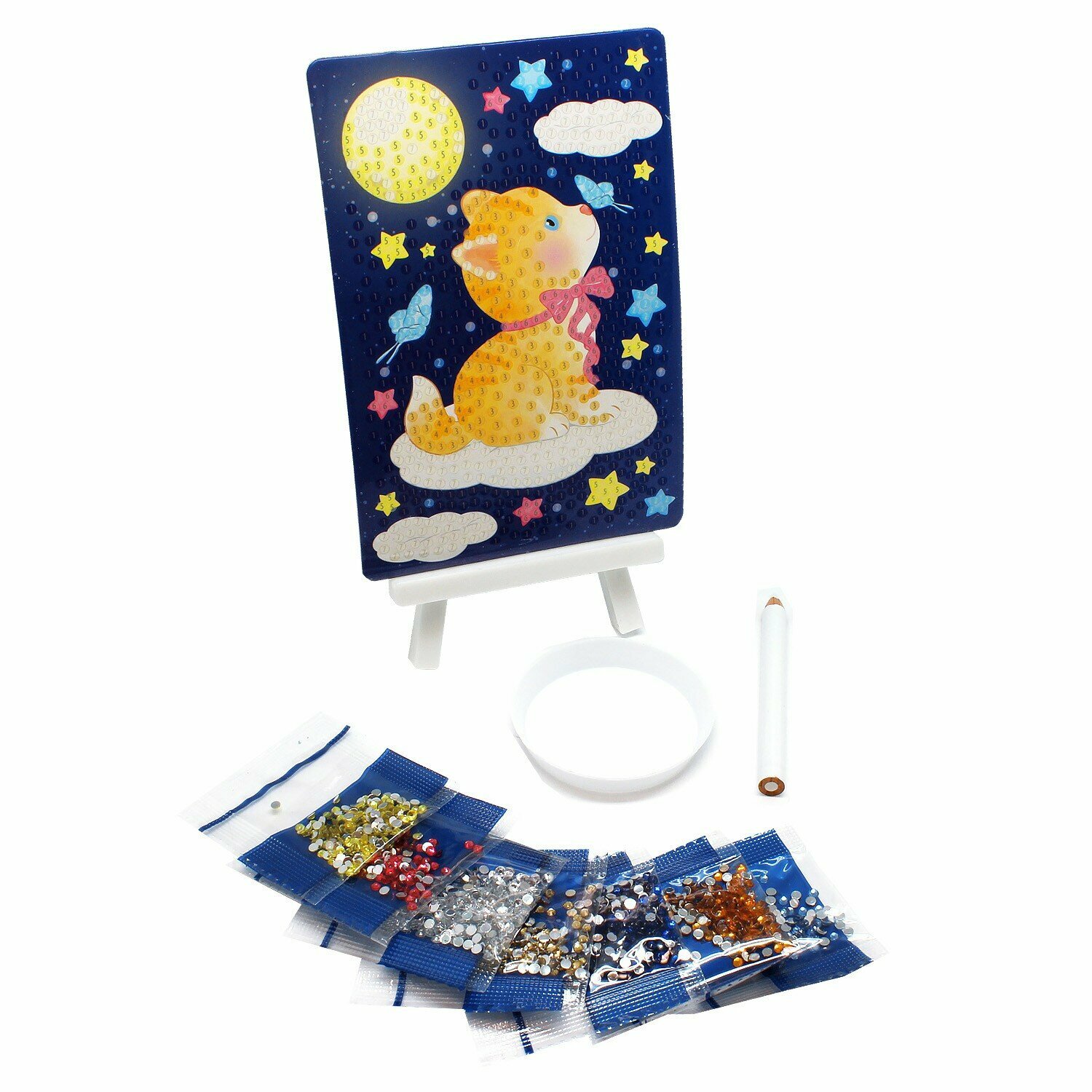 Комплектность: картинка 10х15 см с клеевой основой, стразы, тарелочка, карандаш-стилус, подставка.