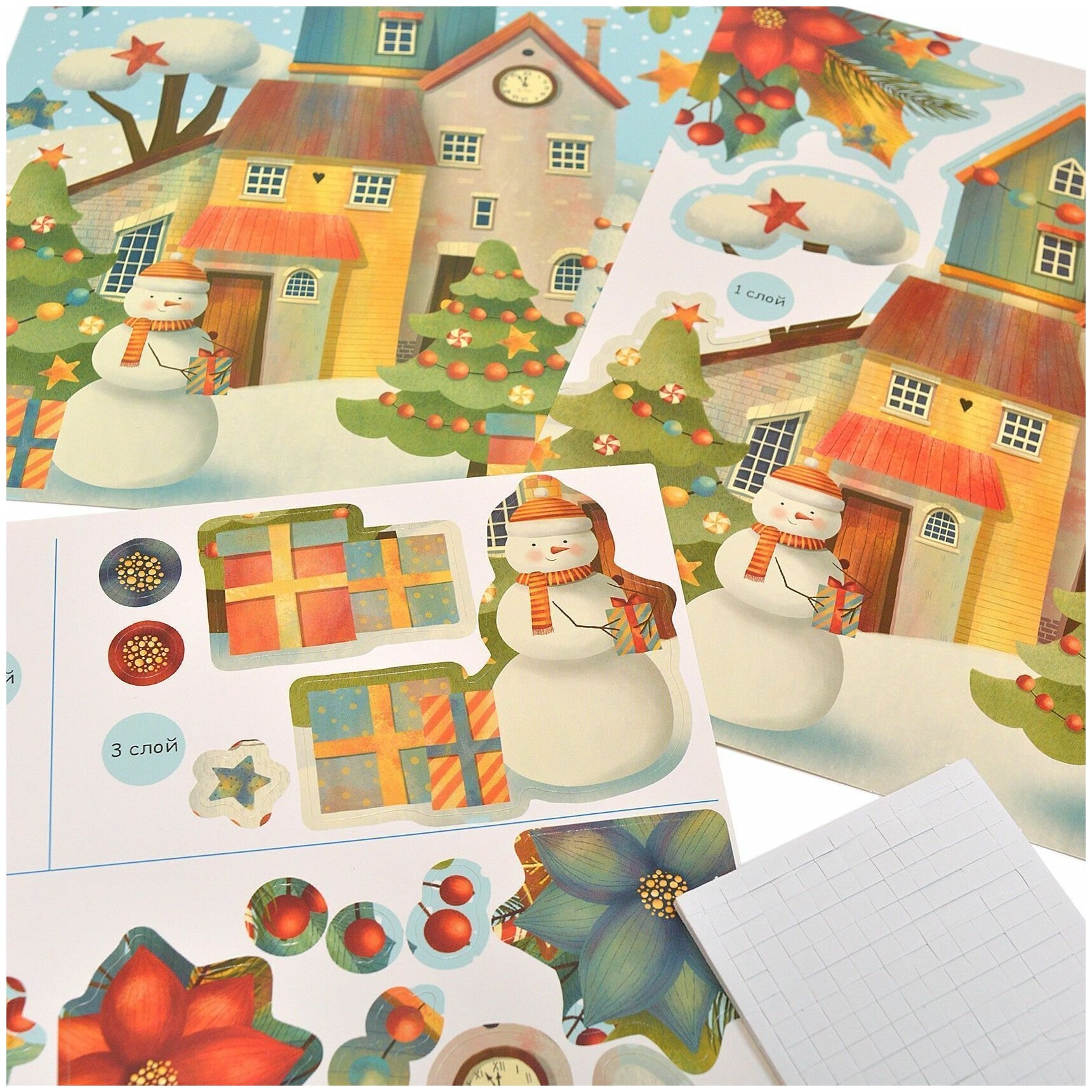 Ребёнок легко сделает объёмную 3D-картинку самостоятельно, ведь клей и ножницы ему не понадобятся. Детали аппликации уже вырублены, нужно только аккуратно выдавить их из основы, и приклеить на картинку объёмным двусторонним скотчем. Изображения снеговика, ёлочек и подарков наклеиваются в несколько слоёв, что придаёт плоскому изображению эффект объёма. Аппликация выполнена в мягкой, приглушённой цветовой гамме, без кричащих цветов и неуместной яркости.