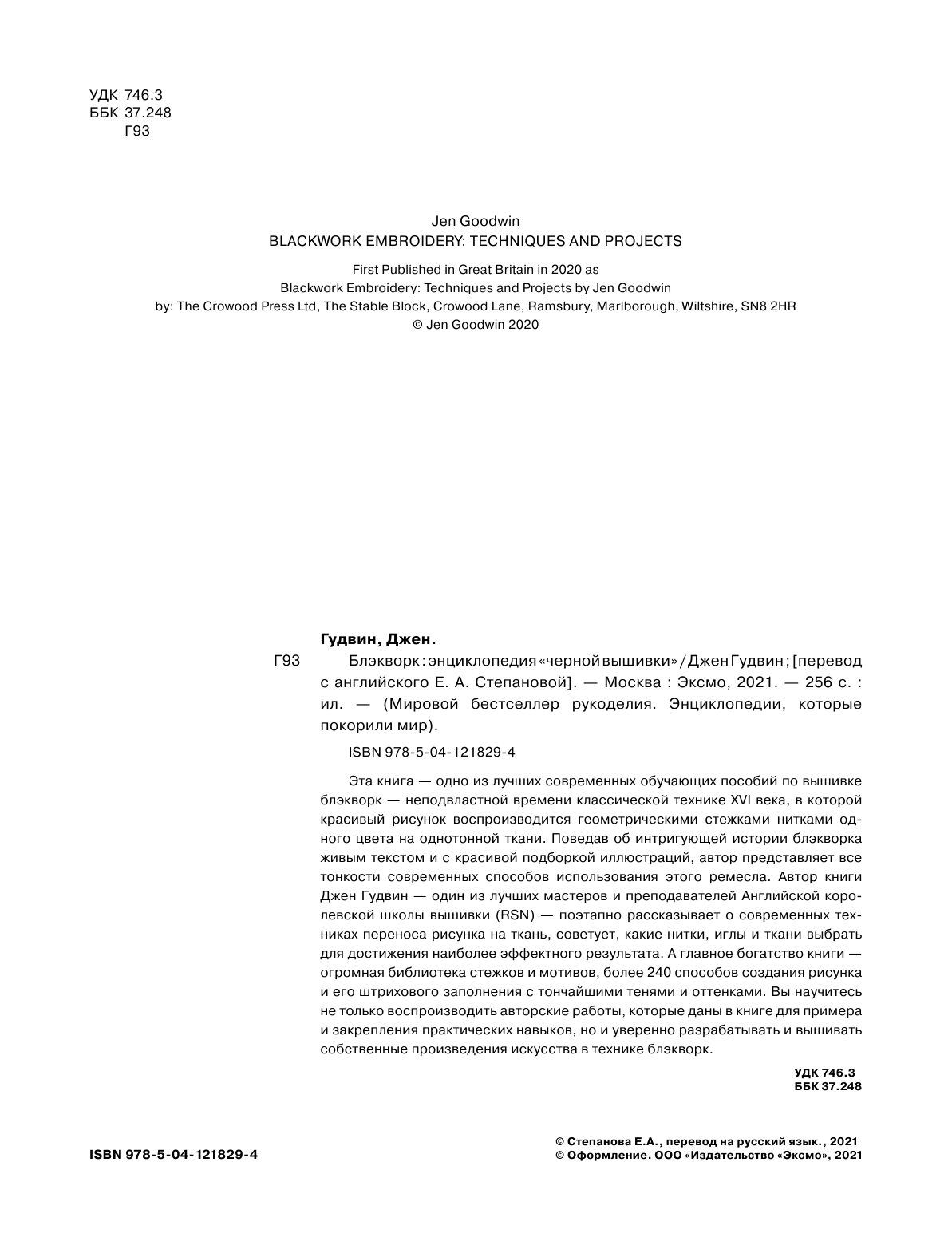 Книга «Блэкворк: энциклопедия «чёрной Вышивки» Д. Гудвин заняла почетное место в моей коллекции книг по рукоделию. Давно ждала выхода подобной книги. Про блэкворк в интернете - только разрозненные отрывочные сведения. Между тем вышивка очень интересная, работы получаются высокохудожественные. В 2019 году приобрела книгу «Большая энциклопедия Вышивки. Английская королевская школа Вышивки». В ней тоже есть раздел, посвящённый блэкворку. По сравнению с этим изданием, в новой книге присутствует неоценимая глава «Разработка дизайна блэкворка». Очень подробно разбираются материалы и подготовительные этапы работы. Приведено множество узоров, причём каждый показан в разных вариантах плотности заполнения ( за счёт толщины нити) (в предыдущей энциклопедии - 35 и одной плотности, в этом - 250). Даны рекомендации по вышиванию различных сюжетов. Разбираются проблемы в работе - распарывание, дырка в ткани, удаление пятен крови. Есть подробное мастер-классы. Считаю, что данное издание - большая редкость по ценности и полноте изложенного материала. Рекомендую книгу вышивальщицам, разрабатывающим самостоятельно свои сюжеты и тем, кто хочет научиться это делать.