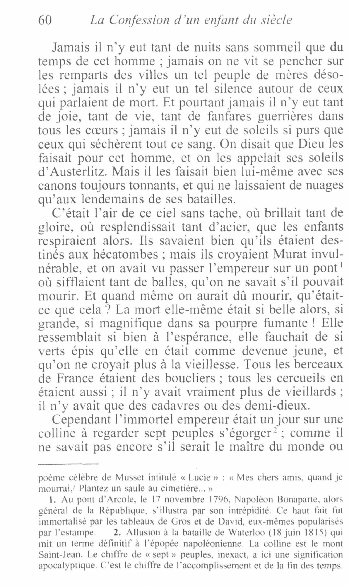 Apres le desastre de Waterloo, l’ennui s’installe avec la paix : « Alors s’assit sur un monde en ruines une jeunesse soucieuse. » Mais l’enfant du siecle ne s’attarde pas longtemps a son epoque et, de maniere assez desinvolte, raccorde a la grande sa petite histoire : celle d’un homme qui se console de la trahison de sa maitresse par une vie de fete et de debauche a laquelle l’arrache brutalement la mort de son pere. Apres quoi l’amour, traverse par la tentation du suicide et du meurtre, ne le conduira qu’a la solitude. La Confession que Musset fait paraitre en 1836 est ainsi un roman qu’il faut lire bien au-dela de la liaison avec George Sand qui vient de dramatiquement se denouer a Venise. A vingt-cinq ans, Musset n’offre pas ici une simple esquisse prometteuse, comme le croyait Sainte-Beuve, mais un testament litteraire qu’il ne depassera pas, un livre ou il devient le heraut d’une generation dont la lecon amere est que, face a l’absurdite de vivre, l’irresolution est la seule attitude lucide. Edition de Frank Lestringant.