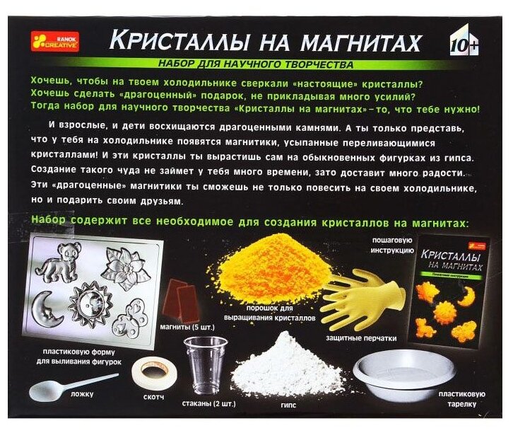 И взрослые, и дети восхищаются драгоценными камнями. А ты только представь, что у тебя на холодильнике появятся магнитики, усыпанные переливающимися кристаллами! И эти кристаллы ты вырастишь сам на обыкновенных фигурах из гипса. Создание такого чуда не займет много времени, зато доставит много радости. Эти «драгоценные» магнитики ты сможешь не только повесить на своем холодильнике, но и подарить своим друзьям. В комплекте: пластиковая форма - магниты (5 шт.) пластиковая ложка скотч порошок для выращивания кристаллов гипс пластиковая тарелка защитные перчатки пошаговая инструкция