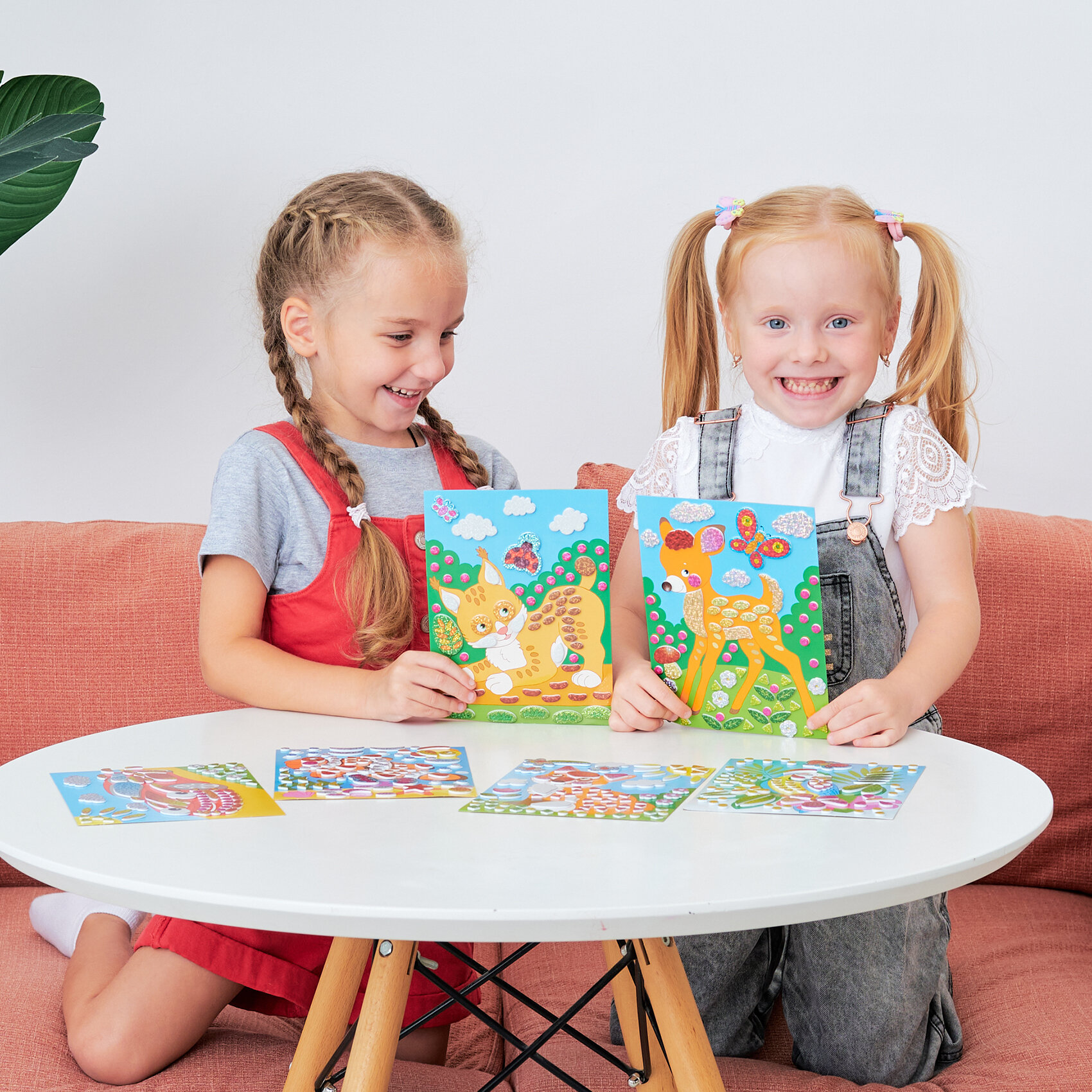 Малыш легко справится с работой, ведь ему не нужны ни клей, ни ножницы: объёмные детали легко приклеятся на картонную основу. Готовая картинка станет прекрасным подарком для родных и друзей, или просто украшением детской комнаты.
