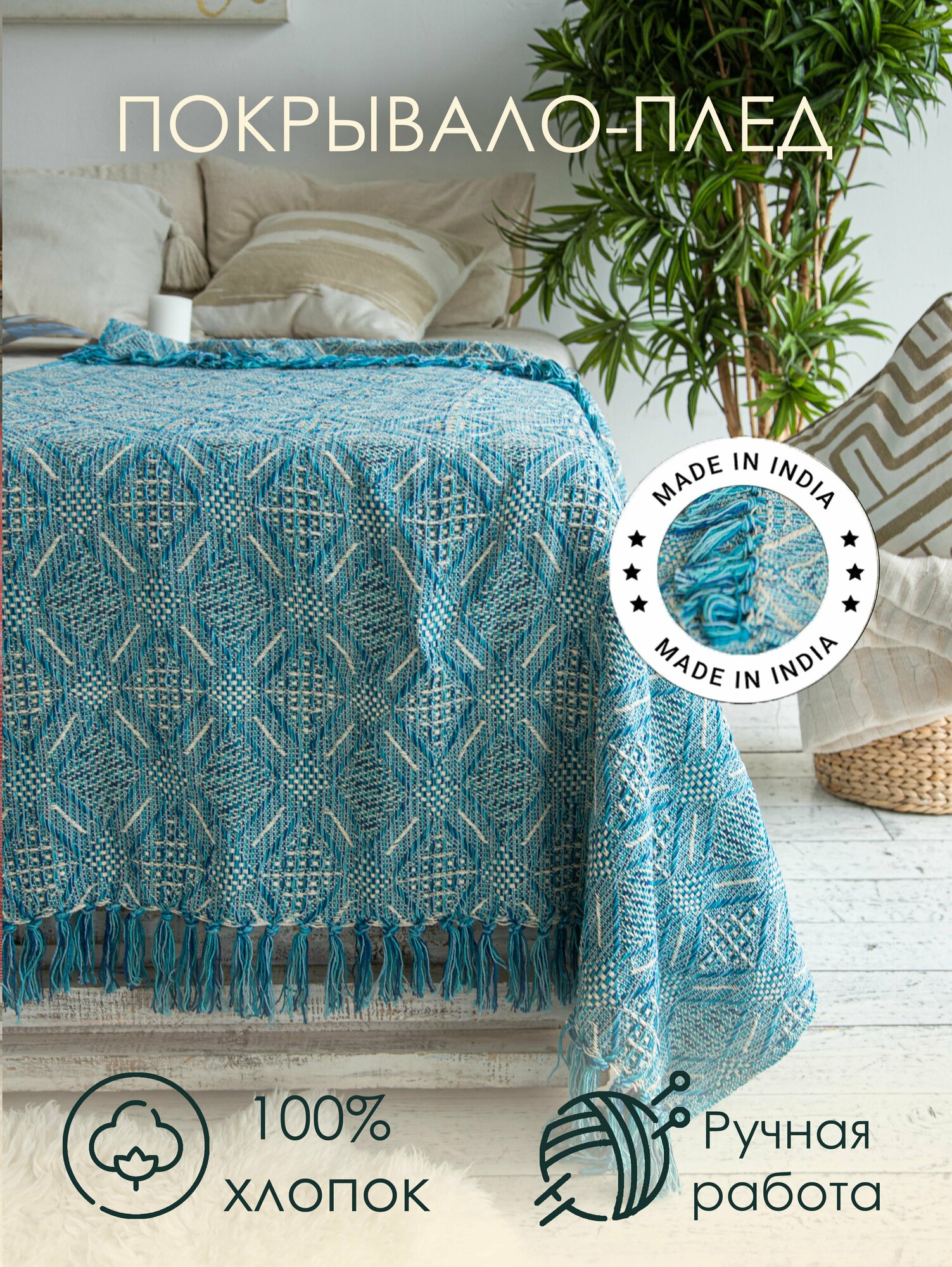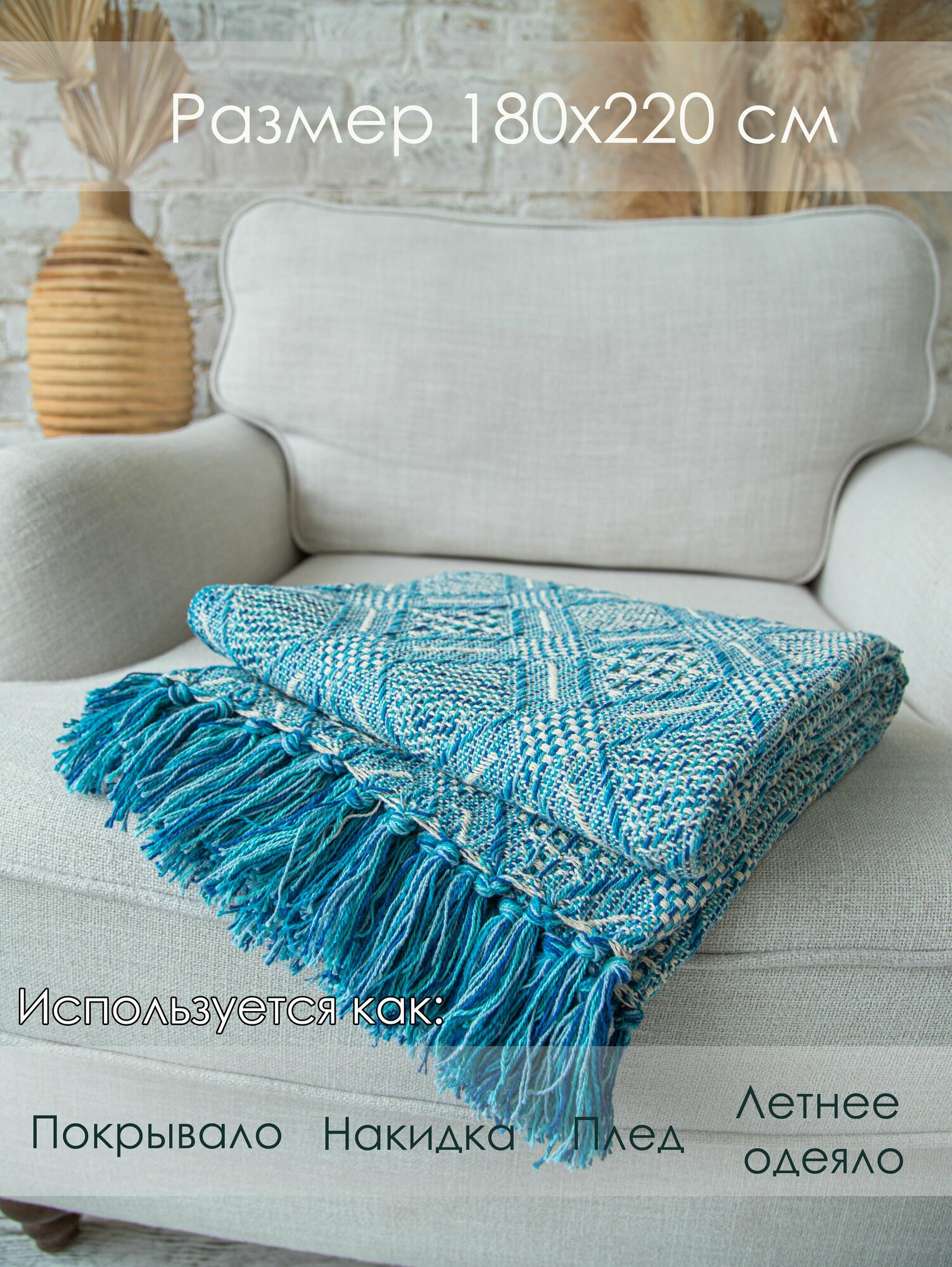Плед, покрывало из натурального хлопка – оригинальный и нужный текстиль для дома и дачи, спальни и гостиной. Индийский плед ручной работы невероятно мягкий и уютный. В нем приятно согреться в холодное время года, а в теплое – он заменит легкое одеяло. Тканевый плед приятный на ощупь и достаточно плотный: выполнен из гипоаллергенного волокна – высококачественного хлопка. В коллекции домашнего текстиля множество расцветок и вариантов исполнения: однотонные, цветные, с фантазийными рисунками, разнофактурные, с цветными нитями, с бахромой и без. Интерьерный плед представлен в размерах 130х170, 140х200, 150х200, 180х220, 220х240 см, идеально подходит для любого спального места: евро, двухспальную (двуспальную), полутороспальную кровать, 200х220, 220х240, 240х260, 140х200, 160х220, 200х240 см, макси. Однотонный плед – универсальная накидка на постельное белье, кресло, прямой или угловой диван. Хлопковое двустороннее покрывало можно использовать не только как диванное, но и взять в дорогу, машину или на пикник. Рекомендуется стирка при температуре 30?С. При первой стирке текстиль может дать усадку 5%. Комплект упакован в прозрачный чехол на молнии. Текстильный плед – отличный подарок на новоселье родным и близким.
