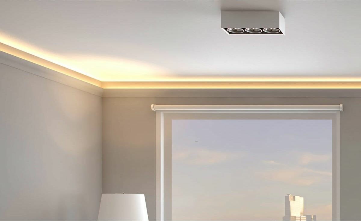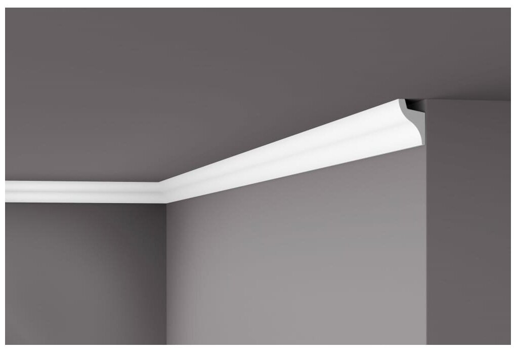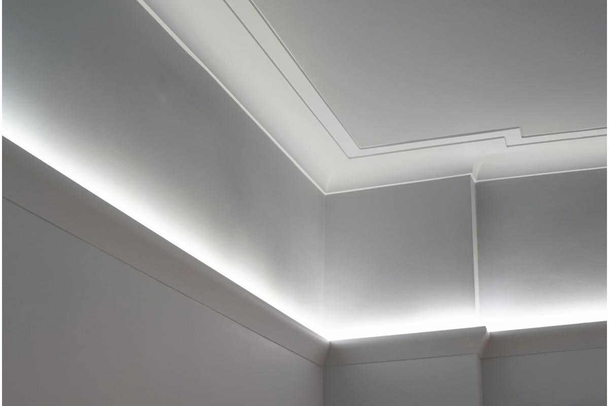 | Цвет | Плинтус потолочный из высокоплотного полистирола. Готов к покраске акриловыми красками и красками, не содержащими растворителей. Лицевая поверхность предварительно окрашена грунтом белого цвета. Тыльная сторона плинтуса серого цвета из-за специальных добавок, не пропускающих световой поток от LED-ленты. |