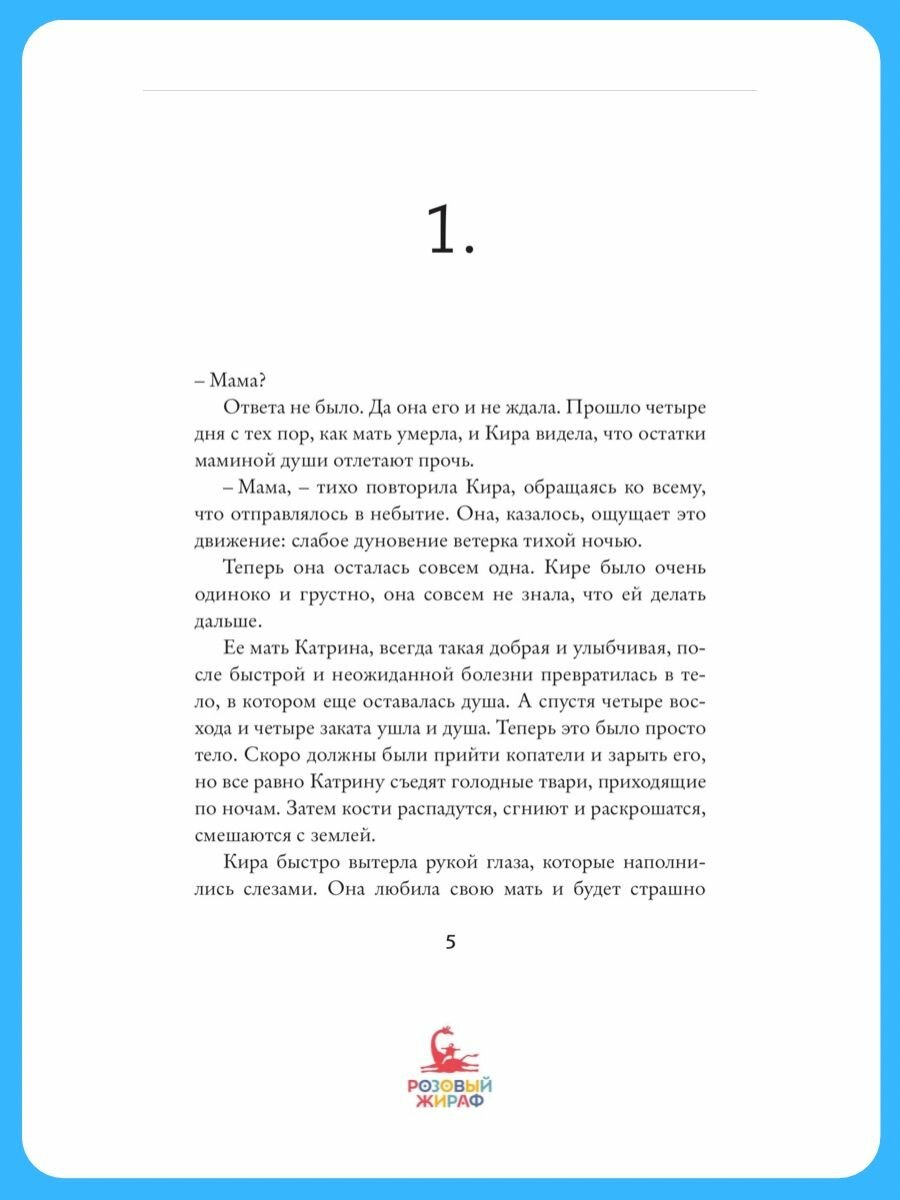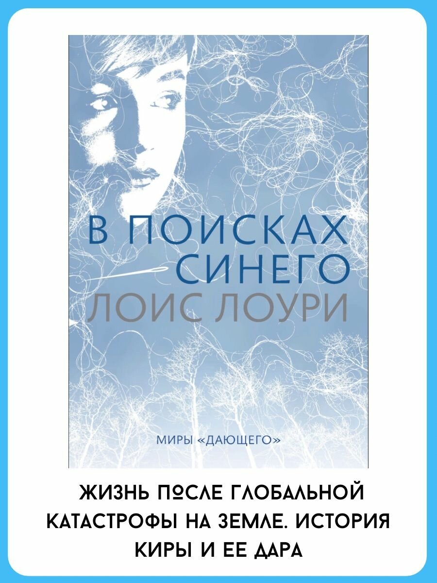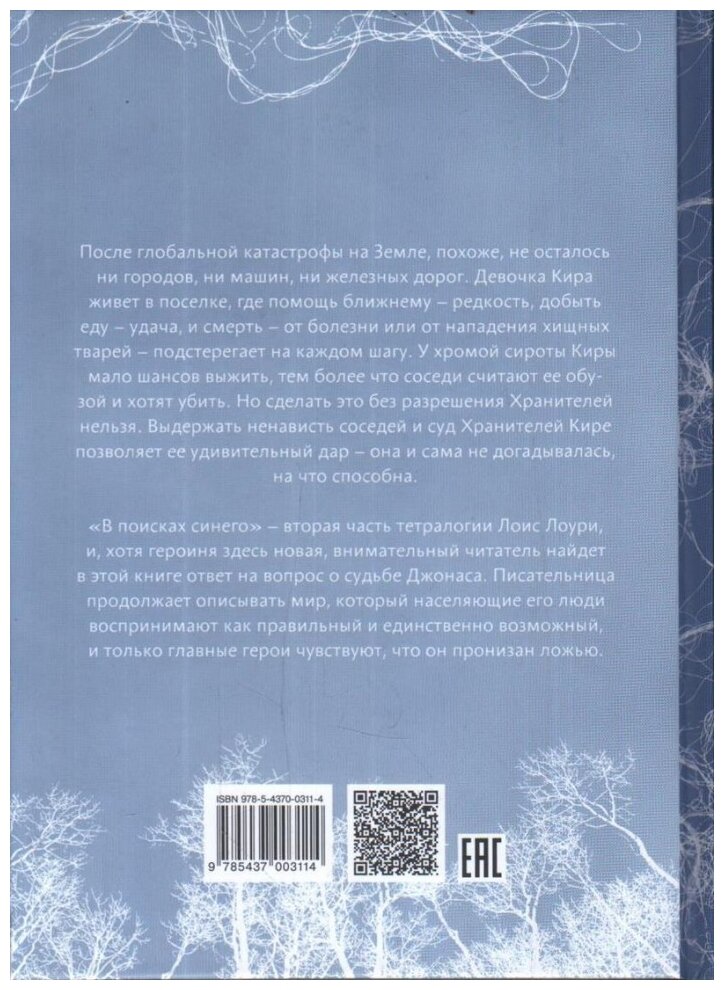 После глобальной катастрофы на Земле, похоже, не осталось ни городов, ни машин, ни железных дорог. Девочка Кира живет в поселке, где помощь ближнему - редкость, добыть еду - удача, и смерть - от болезни или от нападения хищных тварей - подстерегает на каждом шагу. У хромой сироты Киры мало шансов выжить, тем более что соседи считают ее обузой и хотят убить. Но сделать это без разрешения Хранителей нельзя. Выдержать ненависть соседей и суд Хранителей Кире позволяет ее удивительный дар - она и сама не догадывалась, на что способна. "В поисках синего" - вторая часть тетралогии Лоис Лоури, и, хотя героиня здесь новая, внимательный читатель найдет в этой книге ответ на вопрос о судьбе Джонаса. Писательница продолжает описывать мир, который населяющие его люди воспринимают как правильный и единственно возможный, и только главные герои чувствуют, что он пронизан ложью.