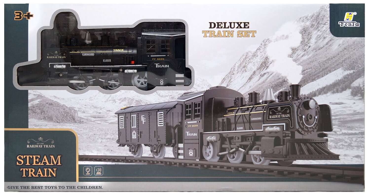 | Комплектация | паровоз - 1 шт, вагон - 5 шт, комбинированные рельсы (прямые с изгибом) - 4 шт, перекрестный рельс - 1 шт, изогнутые рельсы - 10 шт, длинные прямые рельсы - 4 шт, короткие прямые рельсы - 8 шт, украшения - 6 шт, емкость для воды - 1 шт, инструкция |