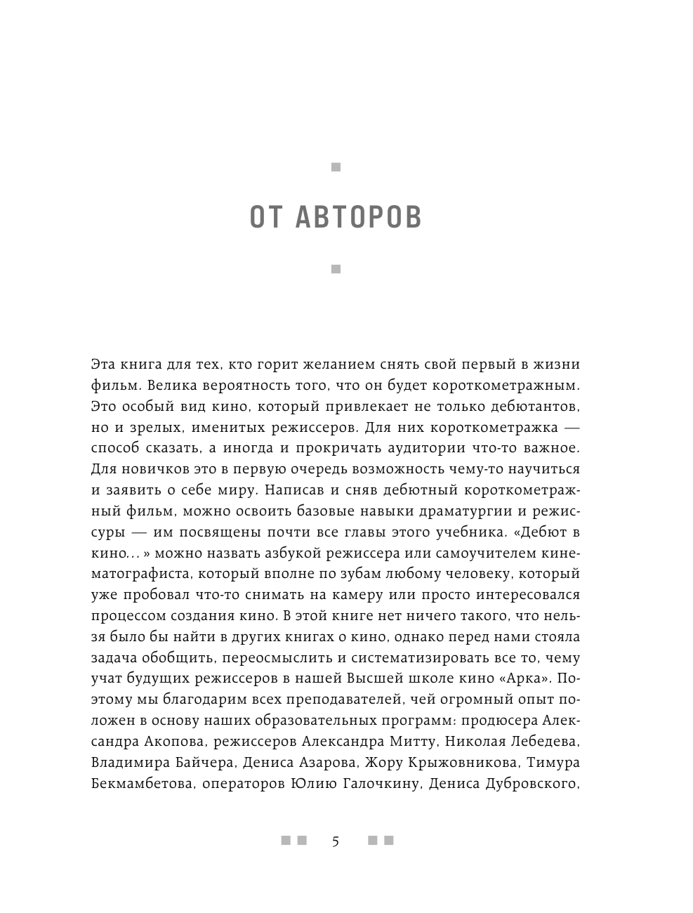 Эта книга для тех, кто горит желанием снять свой первый в жизни фильм. Велика вероятность того, что он будет короткометражным. Это особый вид кино, который привлекает не только дебютантов, но и зрелых, именитых режиссеров. Для них короткометражка – способ сказать, а иногда и прокричать аудитории что-то важное. Для новичков это в первую очередь возможность чему-то научиться и заявить о себе миру. Написав и сняв дебютный короткометражный фильм, можно освоить базовые навыки драматургии и режиссуры – им посвящены почти все главы этого учебника. «Дебют в кино…» можно назвать азбукой режиссера или самоучителем кинематографиста, который вполне по зубам любому человеку, который уже пробовал что-то снимать на камеру или просто интересовался процессом создания кино.
