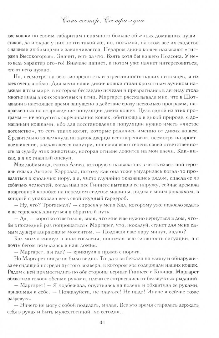 И вновь я складываю вещи в чемодан, проверяю деньги, паспорт и вместе с одной из сестер Деплеси отправляюсь путешествовать по миру. Пятая книга цикла “Сестра луны” получилась еще более необычной, чем предыдущие. Уж очень я ждала, когда речь пойдет о Тигги, ведь она обладает своеобразным пророческим даром. Вслед за Тайгете мы отправляемся в Шотландию, где разыгрывается трагическая и страстная история любви. С удовольствием вновь окунулась в мир Люсинды Райли, где можно свободно путешествовать по миру в поисках себя, своих корней и своего предназначения. Очаровательная книга, как и всегда.