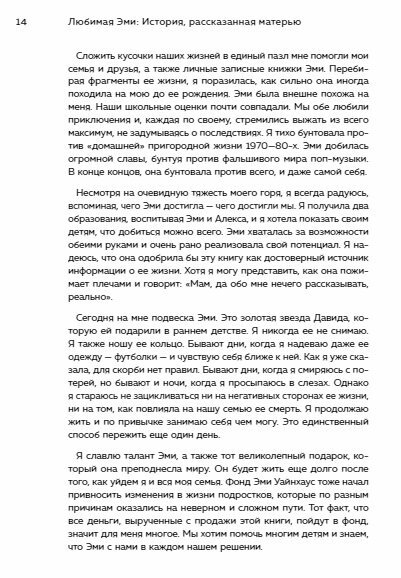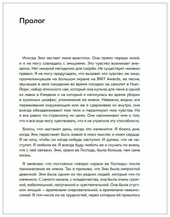 Тем, кто считает Amy Winehouse исключительным исполнителем соул нашего века, тем, кто сожалеет о том, что она не напишет и не исполнит больше новых песен, и не будет больше новых дисков Эми, книга понравится. Просто потому что в ней - часть истории Эми, та, которую видела ее мама как мама. И некоторые фото из домашнего альбома, который часто просматривают близкие умершим в те минуты, когда особенно скучают по любимым, которых больше нельзя увидеть и с которыми нельзя больше поговорить.