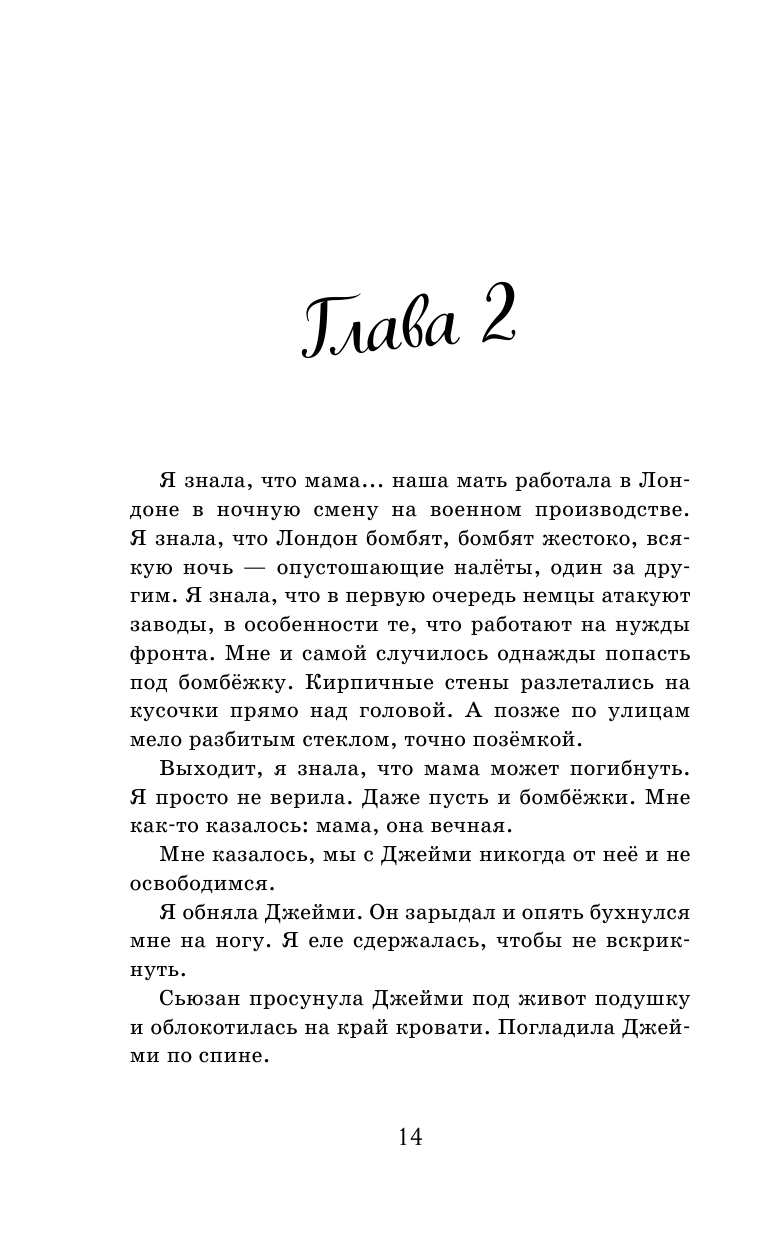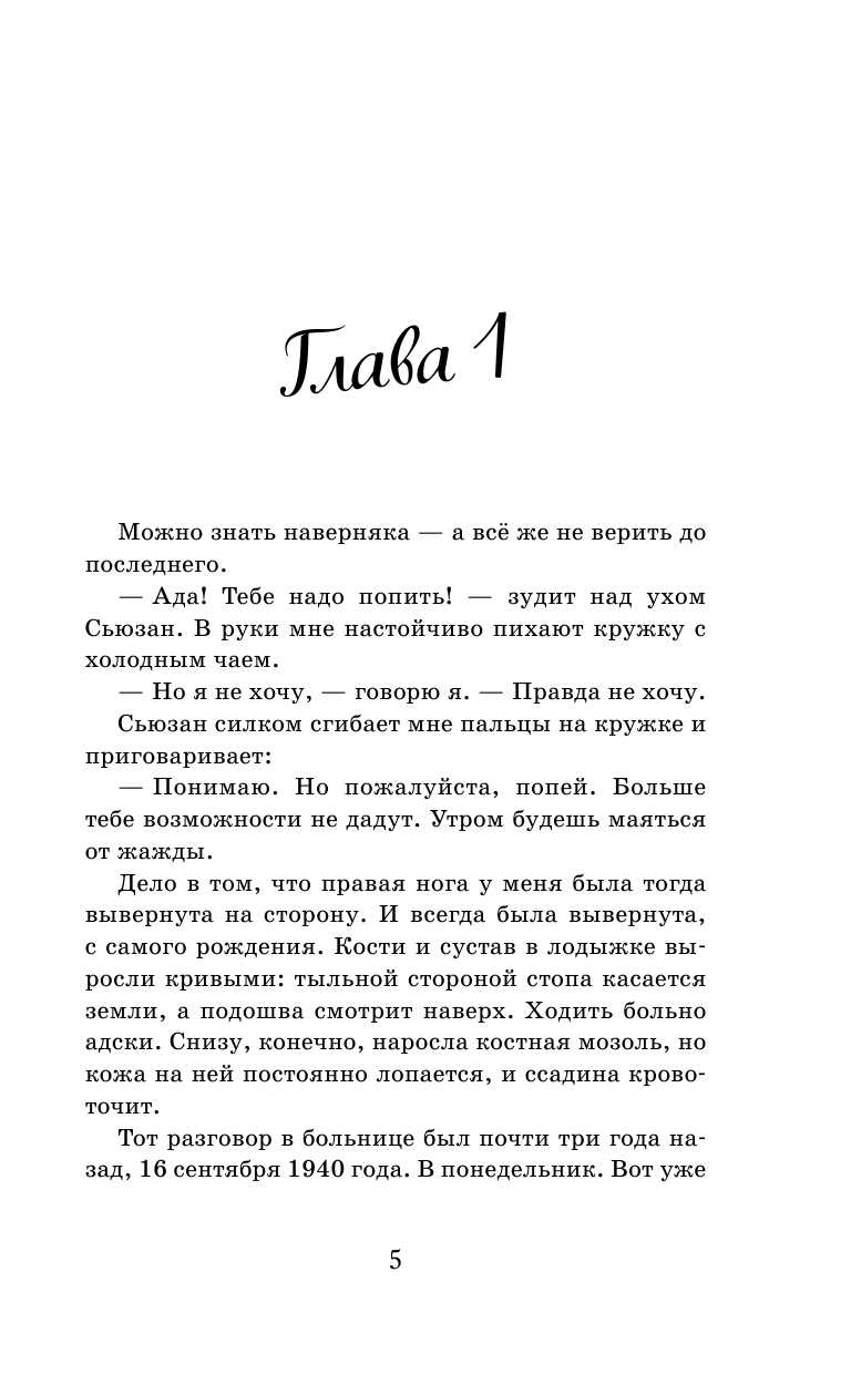 Теперь у Ады есть настоящая любящая семья, и ей, похоже, могут вылечить покалеченную ногу, из-за которой родная мать всегда считала её ничтожеством. Но кто она теперь? Она не дочь, ведь у неё нет матери, она больше не калека и не изгой, она не эвакуированный ребёнок из разбомблённого Лондона, да и вроде не сирота даже, ведь у неё есть опекун… Как найти себя, когда в мире бушует война, люди появляются в жизни и исчезают, а тот, на кого она только-только позволила себе положиться, может тоже её оставить — и на этот раз навсегда? Ещё немало сражений ждёт Аду, пусть она никогда не бывала на фронте. Хватит ли у неё отваги и силы выстоять в этой войне? Продолжение «Войны, которая меня спасла» — истории, которая поразила сердца тысяч читателей, — на американском сайте Амазон на неё оставлено более 3000 отзывов, а на Goodreads — почти 10 000! Это настоящая литература — прочитать её будет интересно и полезно как детям, так и взрослым!