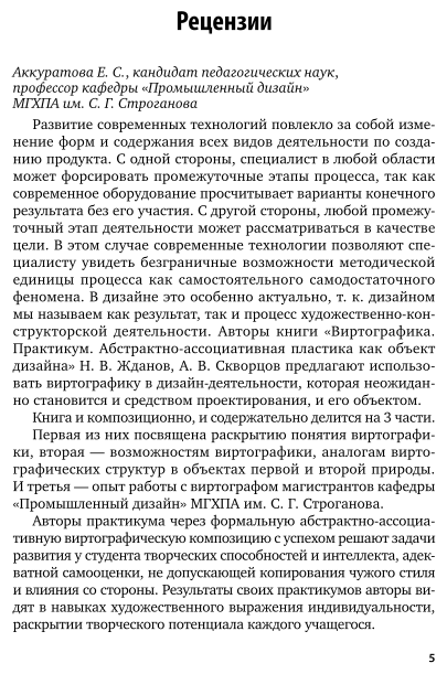 Издание посвящено экспериментальному формообразованию в дизайне, влиянию технологий на развитие проектной культуры современного дизайна. Данная графическая система основывается на эмоциональном «всплеске» чувства художника, при этом сохраняя рукотворность и индивидуальность знакового изображения, не являясь готовым решением, но подсказывая определенные ассоциации. Формальная абстрактно-ассоциативная виртографическая композиция, «от абстрактного к конкретному», с успехом решает задачи развития у студента творческих способностей и интеллекта, адекватной самооценки, не допускающей копирования чужого стиля и влияния со стороны. Соответствует актуальным требованиям федерального государственного образовательного стандарта среднего профессионального образования и профессиональным требованиям. Данное издание может быть интересно как начинающим дизайнерам, так и мастерам дизайна, потому что предложенная технология виртографики открывает возможность по-новому взглянуть на дизайн.