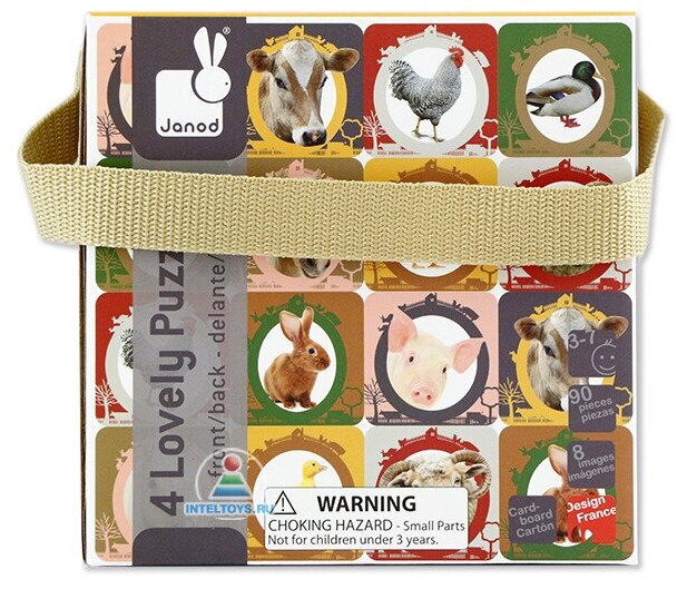 Пазл двухсторонний Животные фермы, 16-20-24-30 эл , производства французской компании Janod, предназначен для малышей от 3 лет.Все элементы пазла выполнены из плотного высококачественного картона. В комплекте 4 карточки размером 20х20 см, разделенные на разное количеств элементов. Пазл на 16 элементов, 20 элементов, 24 и 30.Карточек 4, а картинок 8, как это получилось? Просто изображение на карточки нанесено с двух сторон. Изображенные на картинках обитатели фермы прорисованы очень детально, используются натуральные цвета и оттенки: синий, зеленый, розовый, красный, бордовый, оранжевый, желтый, коричневый, серый..
