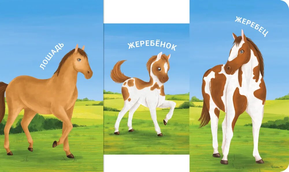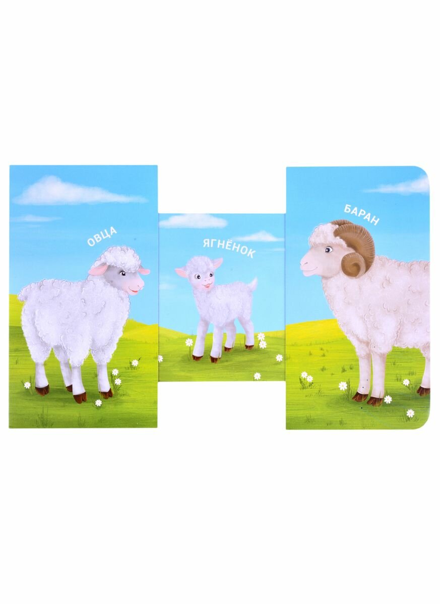 Раздвижная книжка-картонка «Мама, папа и малыш. Домашние животные» познакомит вашего малыша с детенышами животных и их родителями.