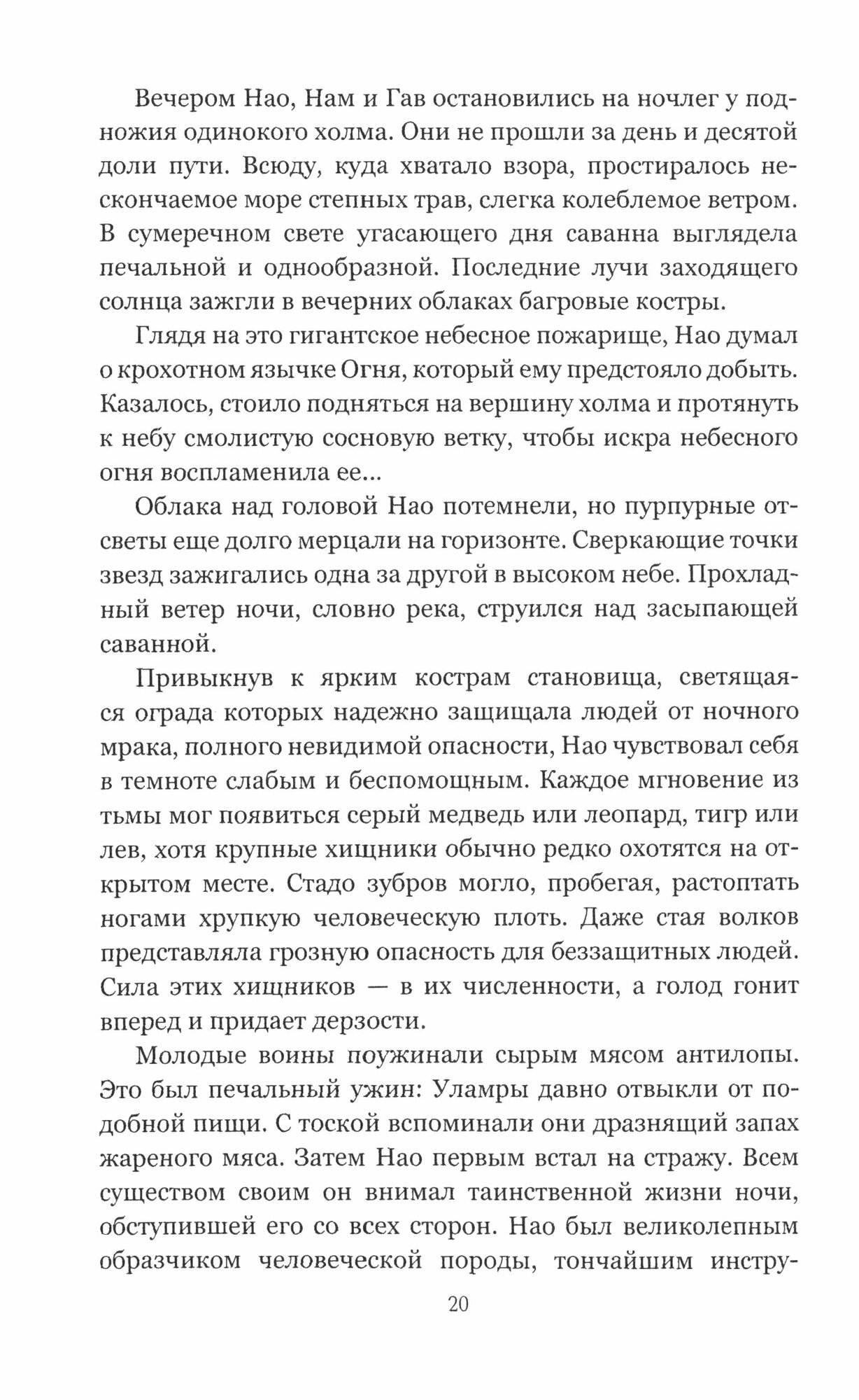 Мы ничего не знаем о древних людях. Учёные исследуют останки и места стоянок и пытаются воссоздать их быт. Автору удалось не сорваться в безумную фантазию, а довольно логично описать те давние события. Создать реальность. Огонь. Благодаря ему наши далёкие предки получили возможность готовить пищу, обогревать жилища, отпугивать хищников. Нет огня, нет защиты. История того, как отважные люди пошли добывать утраченное. Как они учились на своих ошибках, как становились сильнее.