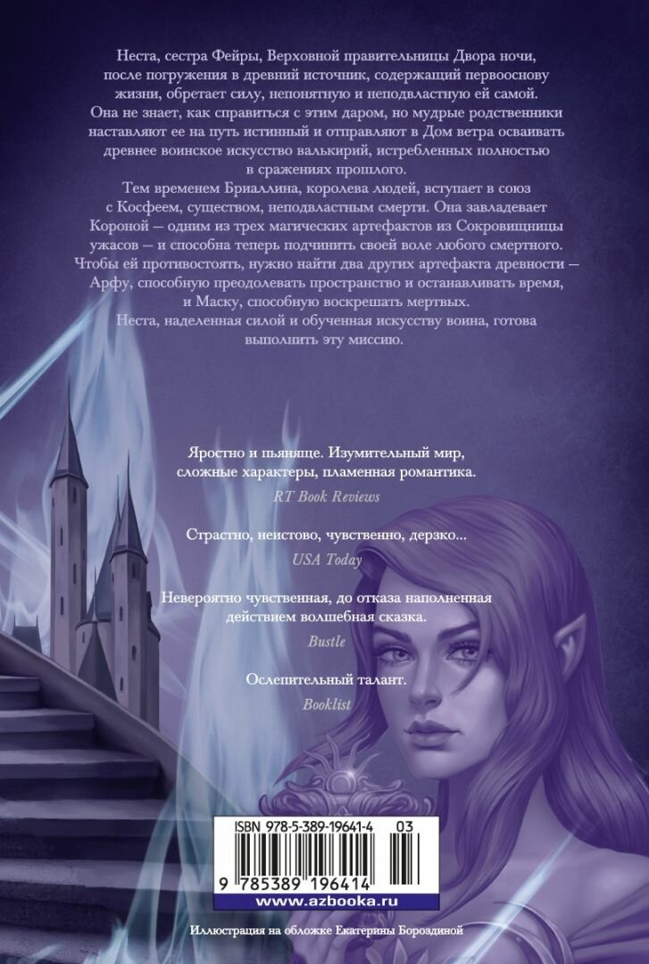 Наконец то я дочитала эту книгу! Очень долго её ждала и почти мигом поглотила её. Конечно эта книга не оправдала поведение Несты и она все равно не поднялась в моих глазах, но я была очень рада снова увидеть Фейру (боже мой какой она стала замечательной), Риза (самый идеальный мужчина), Кассиана (его так хорошо раскрыли в этой книге) и многих других. Под конец мне правда показалось что все стало происходить слишком быстро и предметы сокровищницы я думала больше раскроют, надеюсь в следующей книге Саары нам расскажут чуть больше про арфу. Всем советую прочитать данную книгу, хотя бы ради того чтобы ещё раз увидеть Фейру и Риза. Несте конечно я не простила её отношения к Фейре, да и надеюсь Элайну начнут раскрывать. Вообщем ставлю этой книге 10/10 и с нетерпением жду следующей части и продолжения Города Полумесяца.