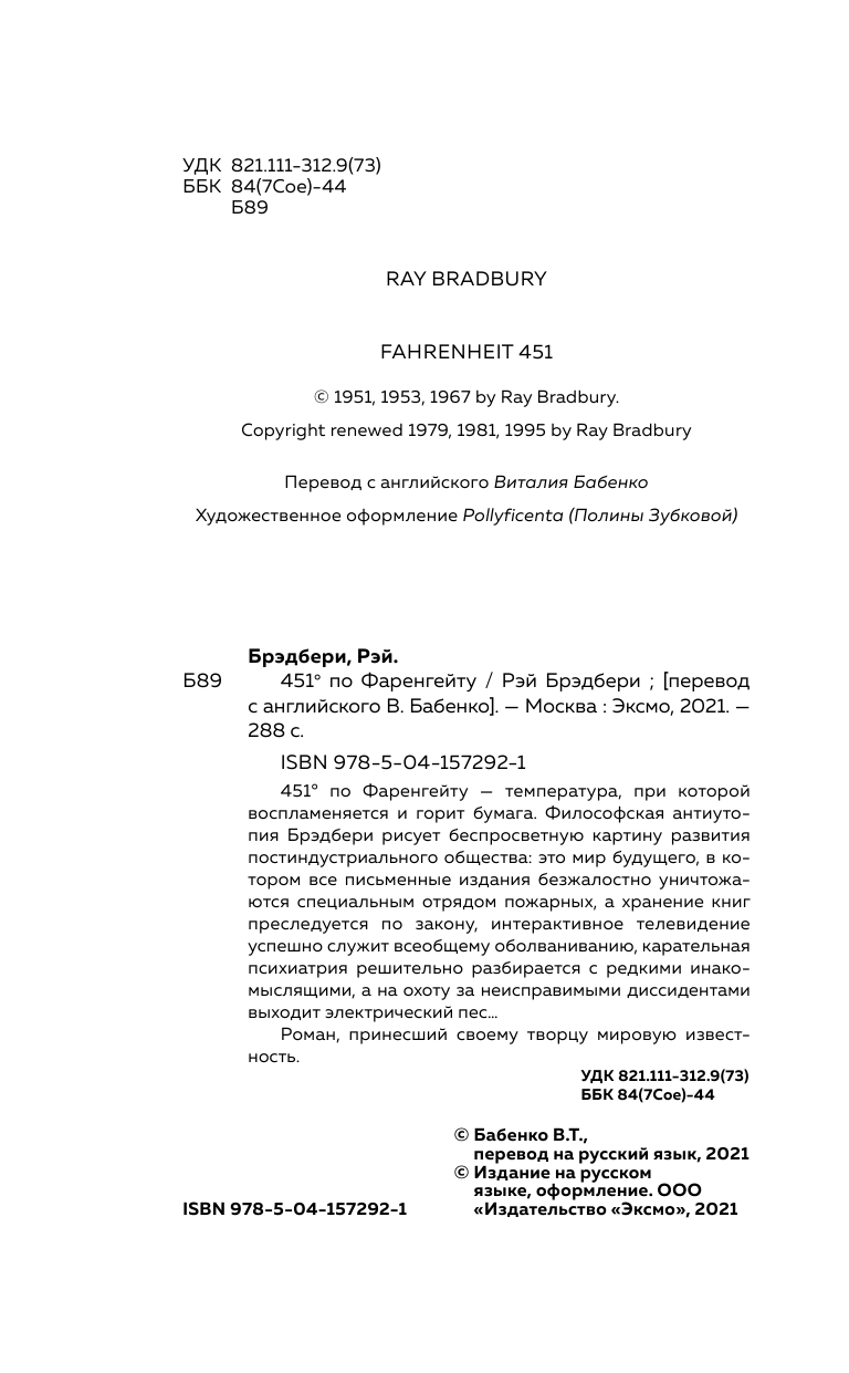 Книга: 451' по Фаренгейту (Рэй Брэдбери); Эксмо, Редакция 1, 2021