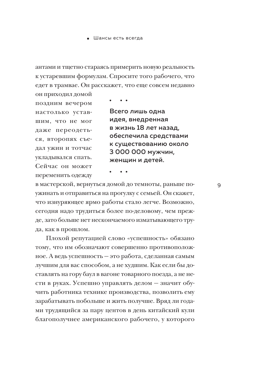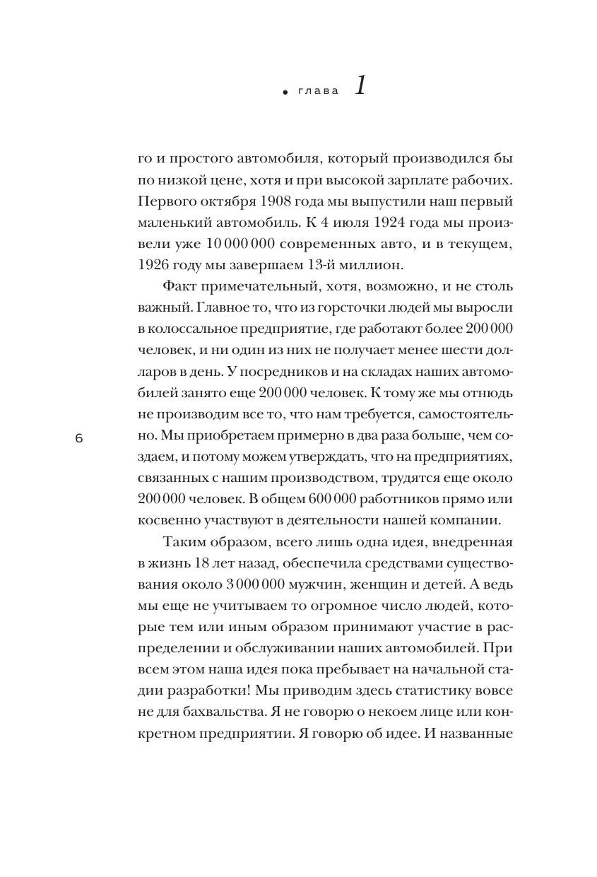В ранее прочитанных книгах: "Генри Форд. Моя жизнь", "Время - деньги" и "Кодекс миллиардера" обнаружил сходство языковой стилистики Г. Форда: доступно, последовательно, небестолково и на весомых делах. Например, одно из правил "Бережливое производство" американского предпринимателя отрубило американскую усохшую экономическую ветку страны после великой депрессии: производительность труда увеличилась вдвое, а время работы сократилась до 40 ч в неделю.