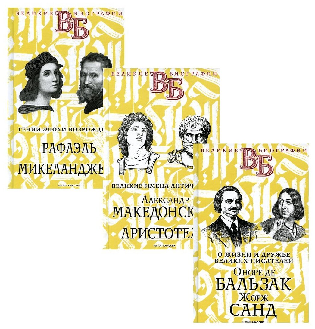 В комплект "Жизнь великих в биографиях" вошли три книги: "Оноре де Бальзак. Жорж Санд. О жизни и дружбе французских писателей" Оноре де Бальзак. Отец натуралистического, реалистического романа - так описывал свой метод: "Я не сочиняю человеческую природу, я ее наблюдаю в ее прошлом и настоящем. Я изображаю людей не такими, какими они должны быть, а такими, какими они на самом деле бывают". Автора считали безнравственным, осуждали за такого рода искренность в изображении французского общества Второй республики. В защиту выступали многие его современники, в том числе романистка Жорж Санд, с которой он дружил на протяжении всей жизни. Жорж Санд. Ей принадлежит одно из почетнейших мест среди представителей французского романтизма. Ее назвали адвокатом всех женщин, так как она боролась с угнетением и предрассудками за истину. Санд наблюдала рассвет и упадок романтизма в литературе. Она признавала достоинства реализма как направления, поддерживая своего дорогого друга, Оноре де Бальзака. "Александр Македонский. Аристотель. Великие имена Античности" Александр Македонский. Романтическая фигура Александра Македонского представляет едва ли не высший тип завоевателя, какой когда-либо видела история. В противоположность Ганнибалу, Цезарю, Фридриху Великому и даже Наполеону, Александр был истый, если можно так выразиться, художник своего дела, у которого конечный момент, даже практический результат отступали на задний план перед внутренним импульсом творчества. Не ища ничего, не руководствуясь никакими соображениями материального или идеального характера, он во все продолжение своей карьеры не знал иного мотива к деятельности, кроме безмерной жажды завоевания, и не видел удовлетворения нигде, кроме как в самом завоевательном процессе, в самом упражнении своих способностей. Аристотель. Более двух тысяч лет прошло со времени рождения Аристотеля, но трудно указать область современного знания, которая была бы не связана с его деятельностью. Аристотель заложил фундамент таких дисциплин, как логика, физика, политика и других. Помимо величайших заслуг перед наукой, он прожил долгую яркую жизнь, в которой он был, среди прочего, учеником Платона, воспитателем Александра Македонского, свидетелем рассвета и падения империи. "Рафаэль. Микеланджело. Гении эпохи Возрождения" Рафаэль. Живописец, график, архитектор, признанный гений, избранник судьбы. Один из ярчайших представителей искусства эпохи Высокого Возрождения родился в темной Умбрии. Так сын скромного художника завершил свою царственную деятельность в Риме, а его творчество - отдельная эпоха в искусстве. Микеланджело. Непримиримый и гордый, мрачный и суровый, Микеланджело Буонарроти воплотил в себе все муки человека Возрождения - борьбу, страдание, протест, неудовлетворенные стремления, разлад идеала и действительности. Микеланджело считают как предшественником, так и преемником Рафаэля в искусстве, однако их отношения сложно было назвать дружескими.